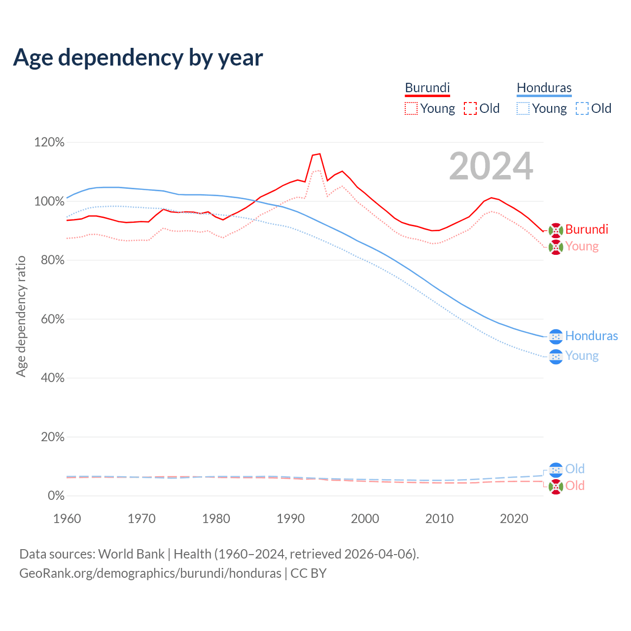 - Burundi is ranked 190/196 by median age (oldest to youngest) vs 134/196 for Honduras.