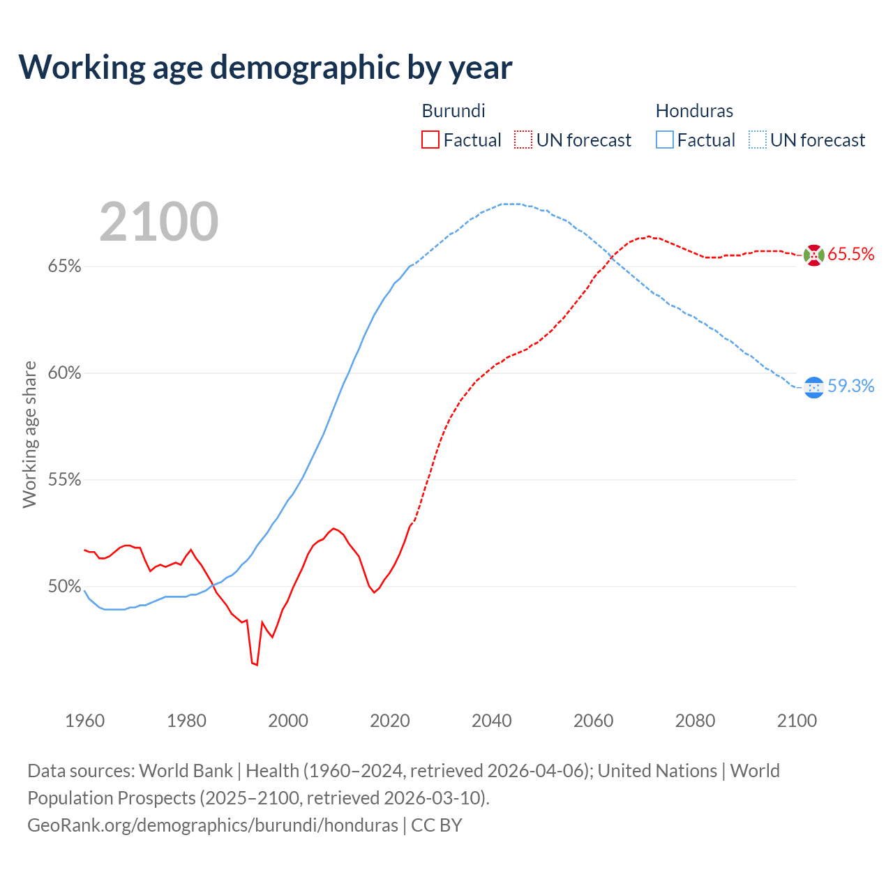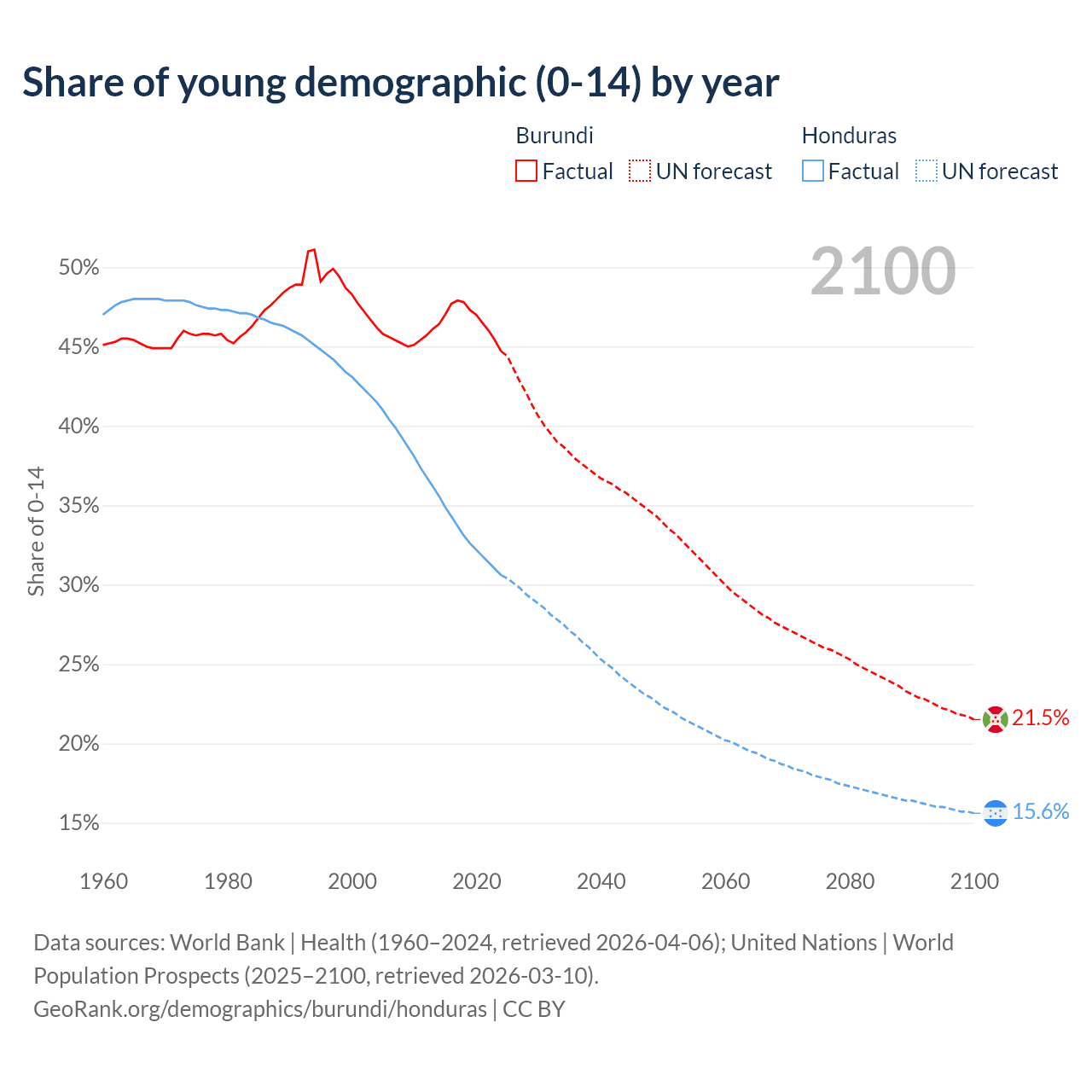 - The share of young demographic (0-15 years old) in Burundi is 44.7% vs 30.6% in Honduras.