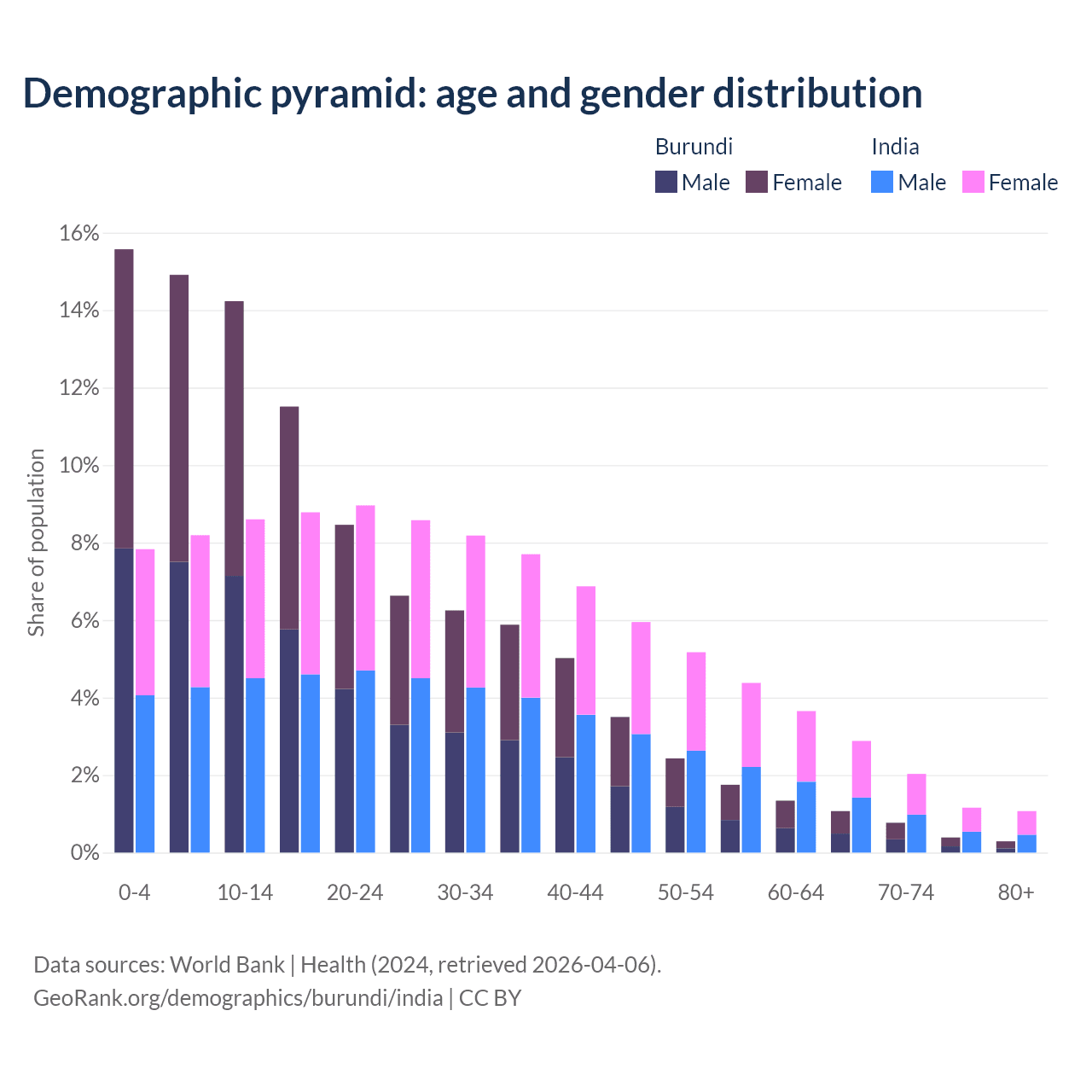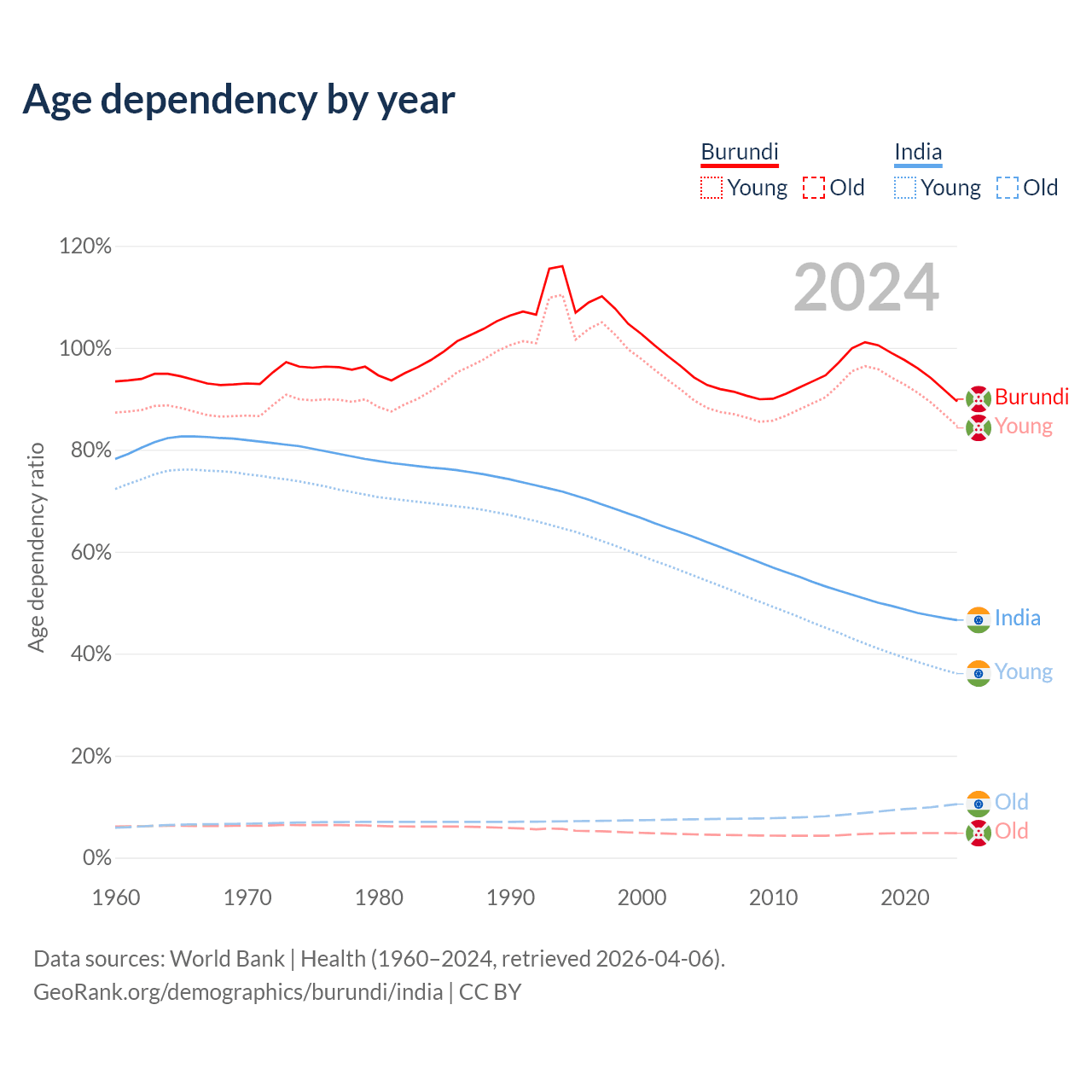- Burundi is ranked 190/196 by median age (oldest to youngest) vs 108/196 for India.