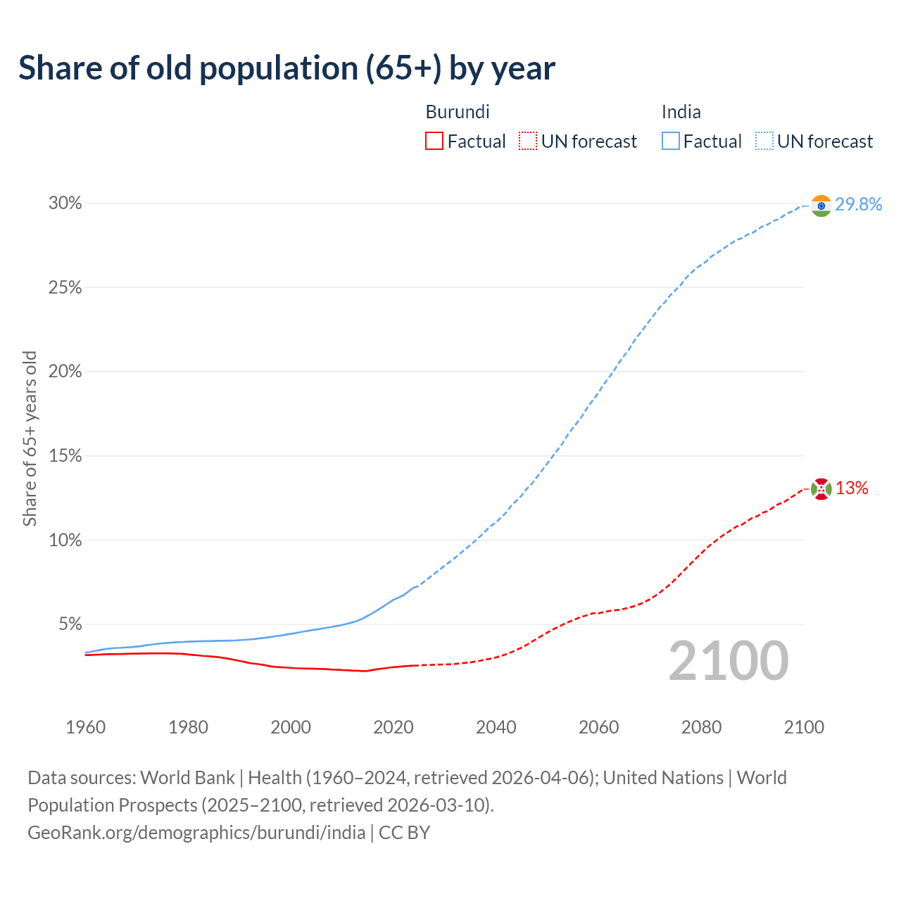 The share of older people aged 65 and over is 2.53% in Burundi and 7.15% in India. Life expectancy in Burundi compared to India .
