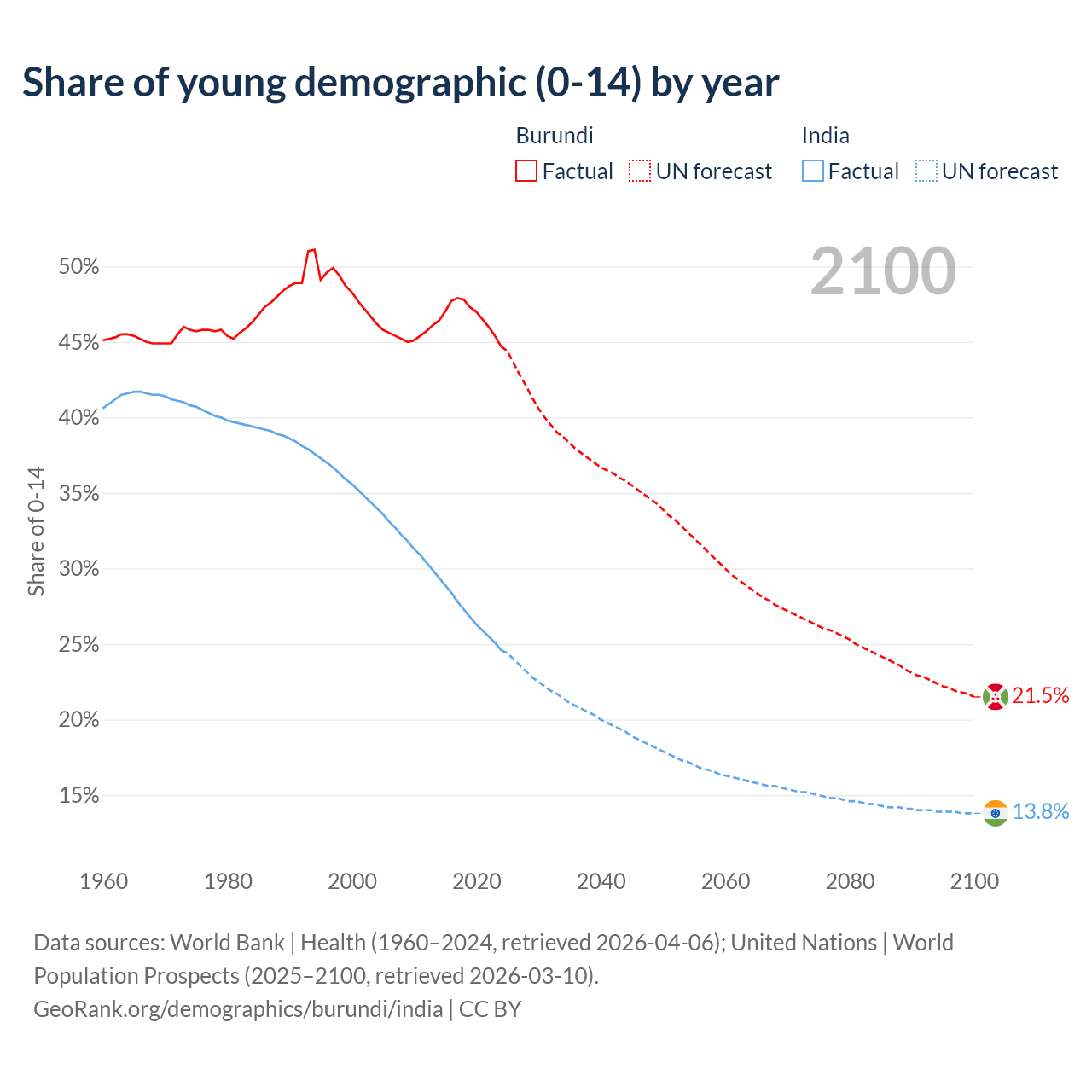- The share of young demographic (0-15 years old) in Burundi is 44.7% vs 24.6% in India.