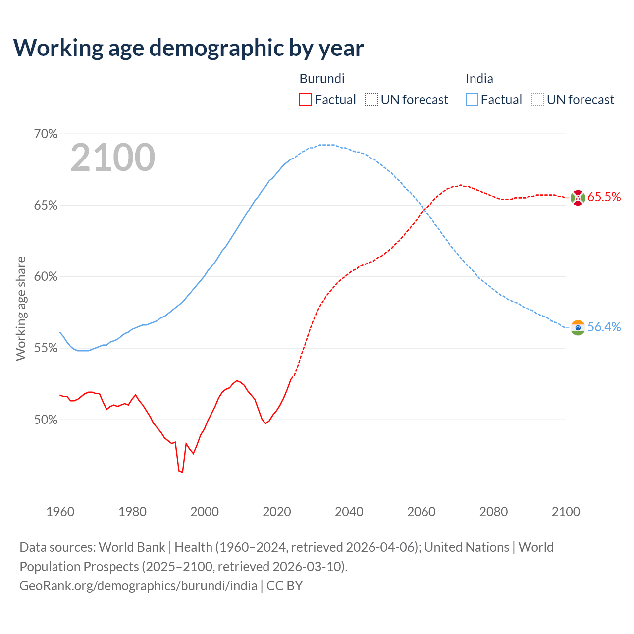 - Burundi has 7.83M working age adults (aged 15-64) vs 1.01B in India.