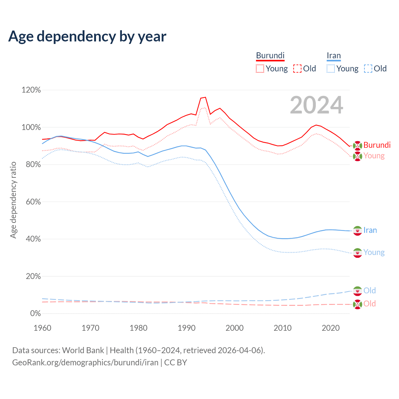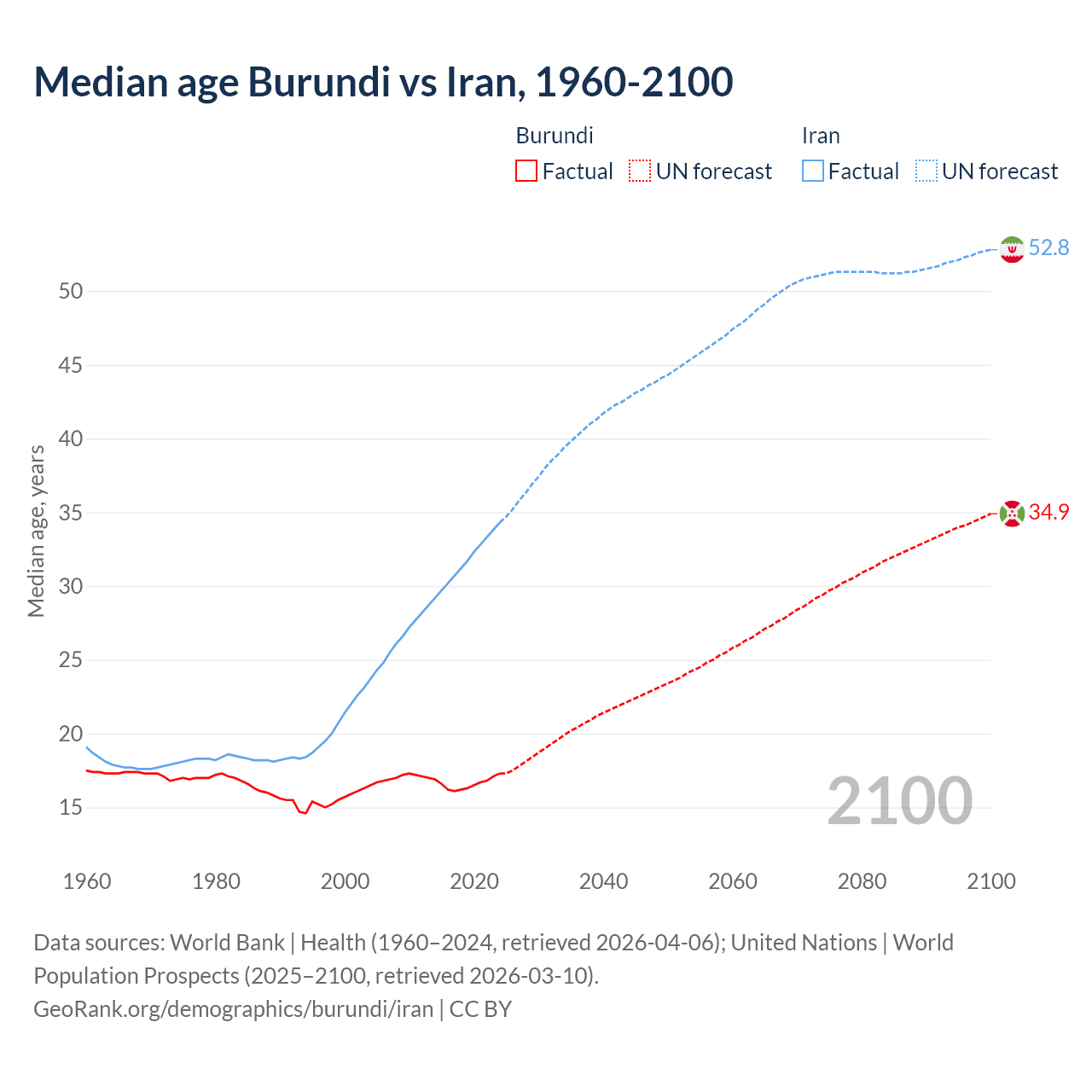 - Burundi is ranked 190/196 by median age (oldest to youngest) vs 79/196 for Iran.