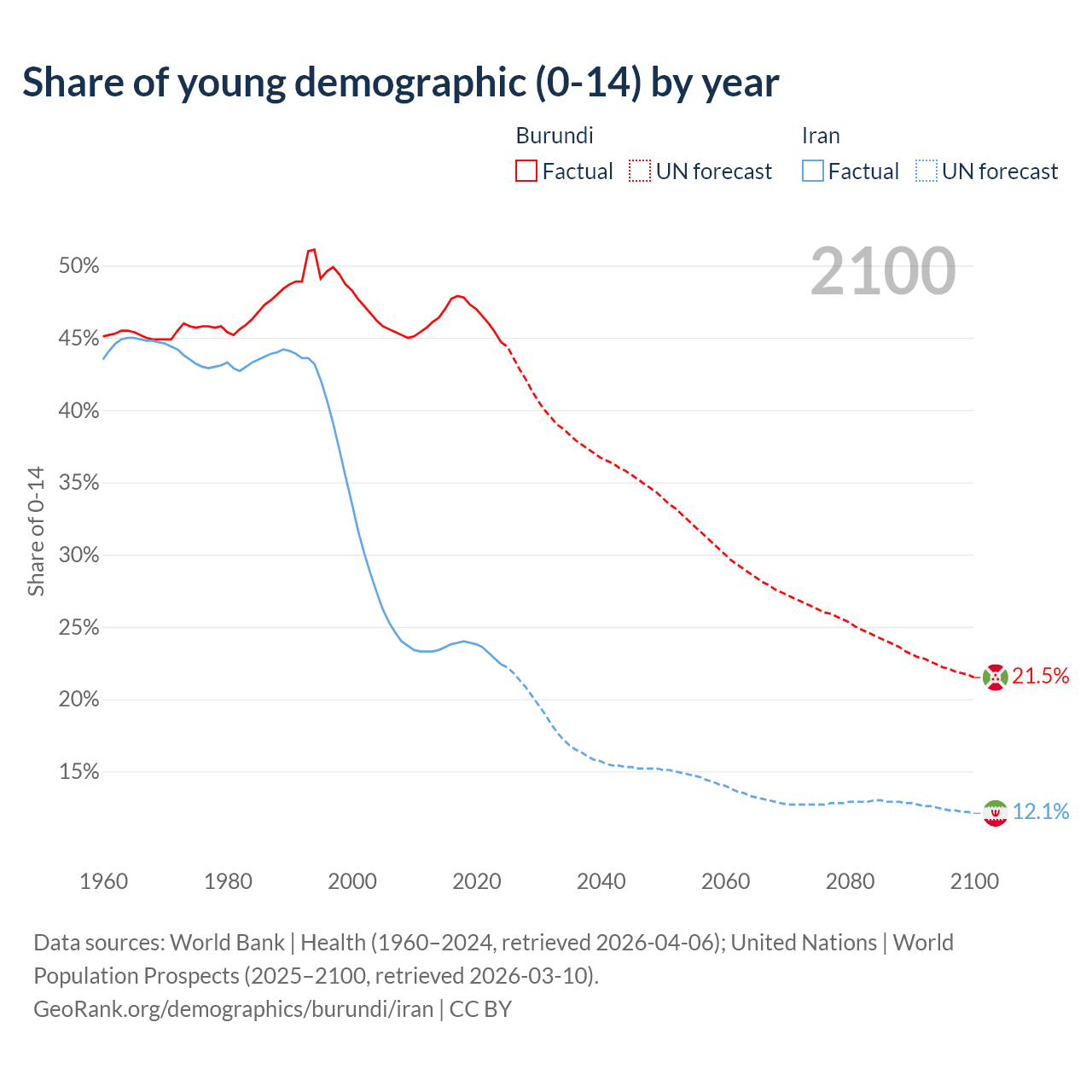 - The share of young demographic (0-15 years old) in Burundi is 44.7% vs 22.4% in Iran.
