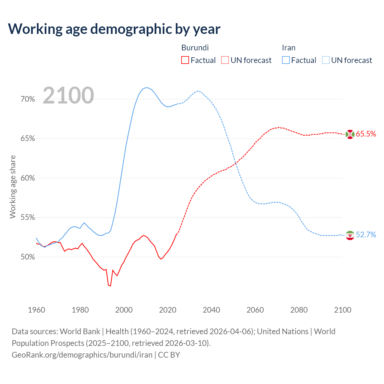 - Burundi has 7.83M working age adults (aged 15-64) vs 64.8M in Iran.