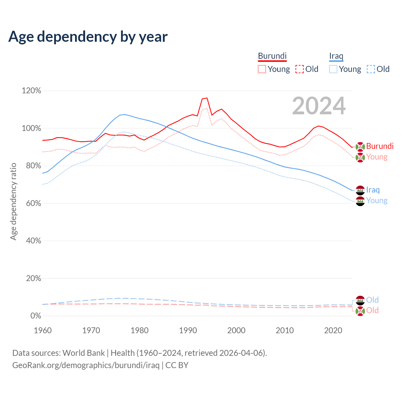 - Burundi is ranked 190/196 by median age (oldest to youngest) vs 151/196 for Iraq.
