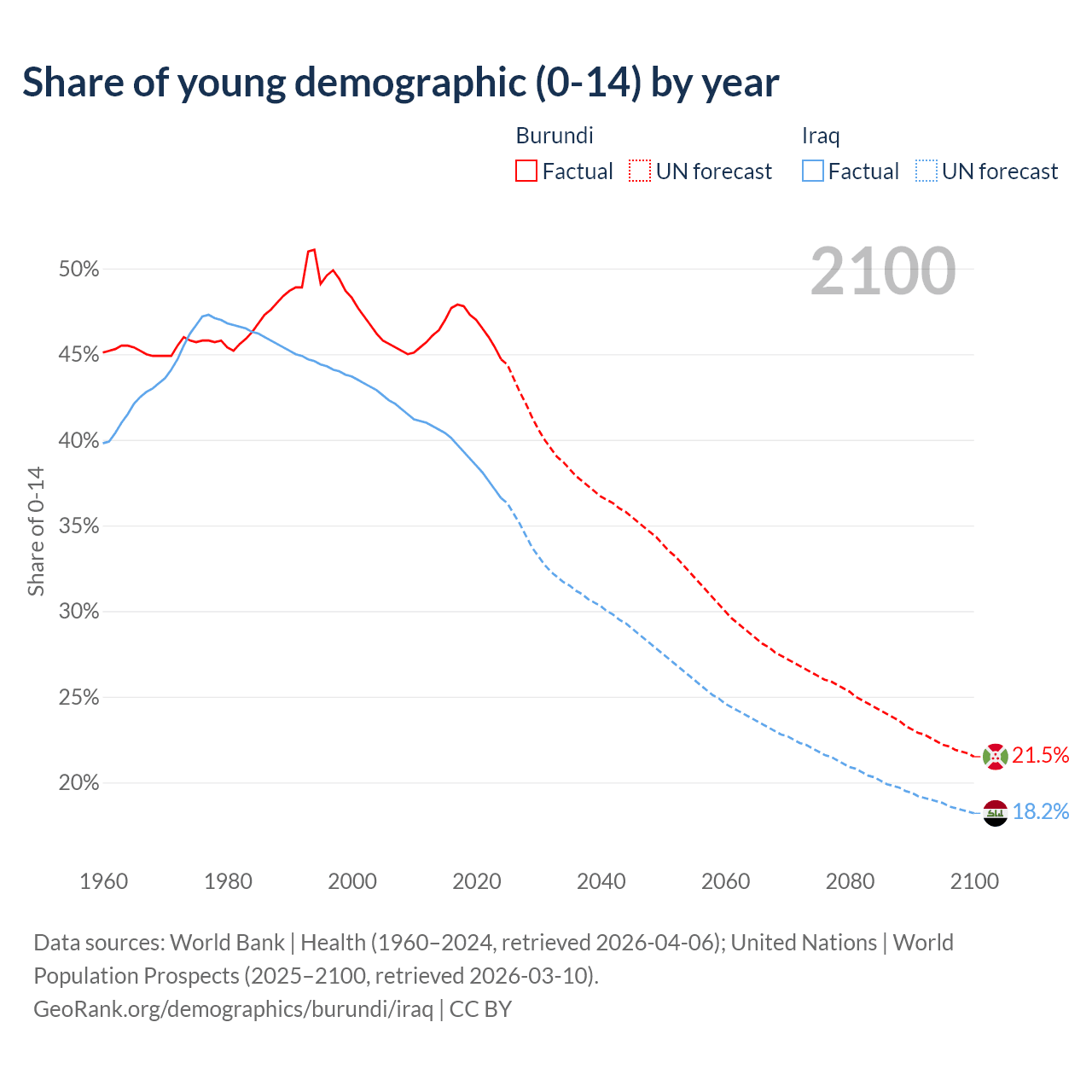 - The share of young demographic (0-15 years old) in Burundi is 44.7% vs 36.6% in Iraq.