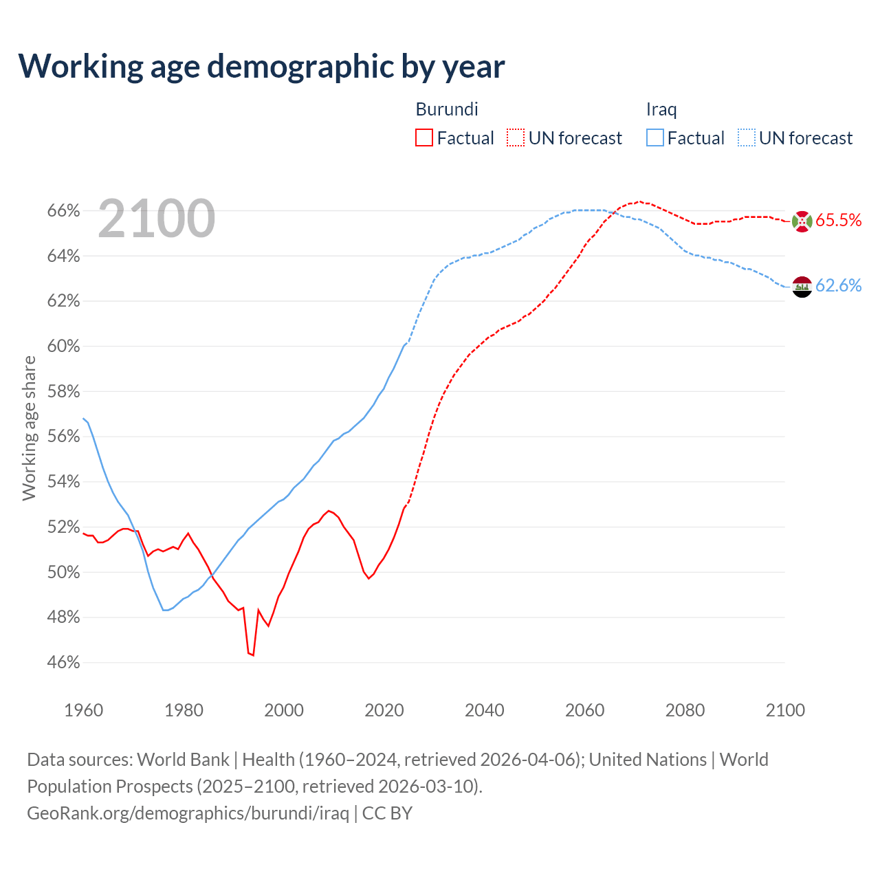 The share of older people aged 65 and over is 2.53% in Burundi and 3.41% in Iraq. Life expectancy in Burundi compared to Iraq .