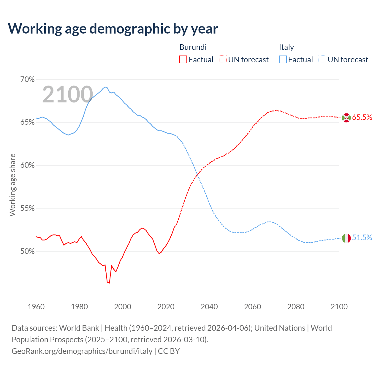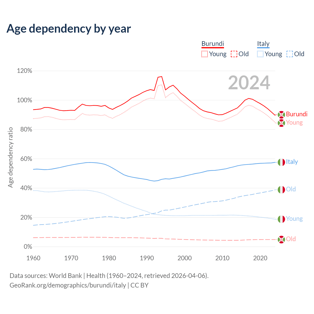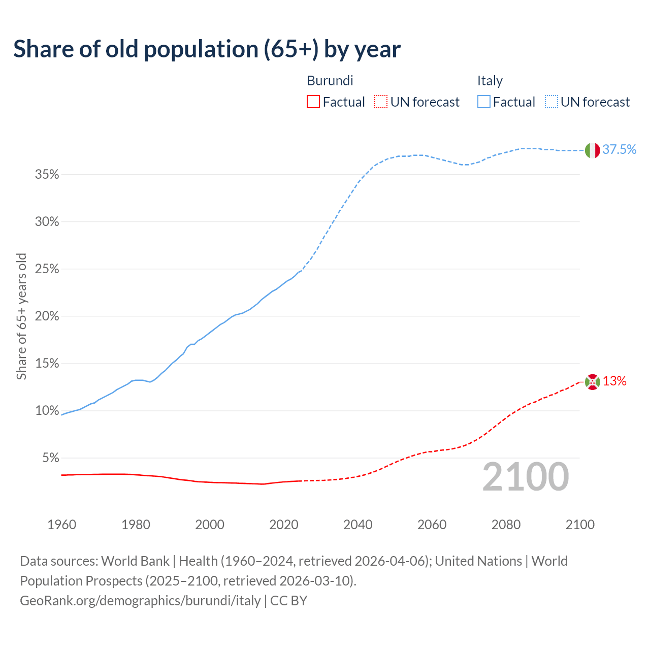The share of older people aged 65 and over is 2.53% in Burundi and 24.6% in Italy. Life expectancy in Burundi compared to Italy .