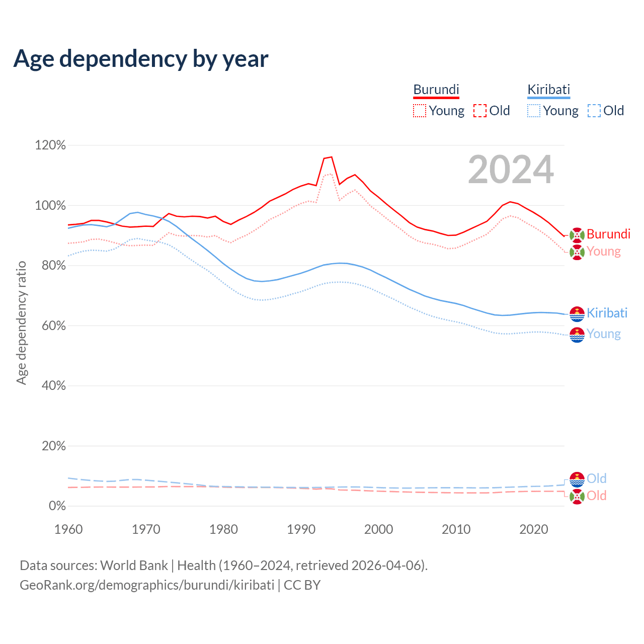 - Burundi is ranked 190/196 by median age (oldest to youngest) vs 139/196 for Kiribati.