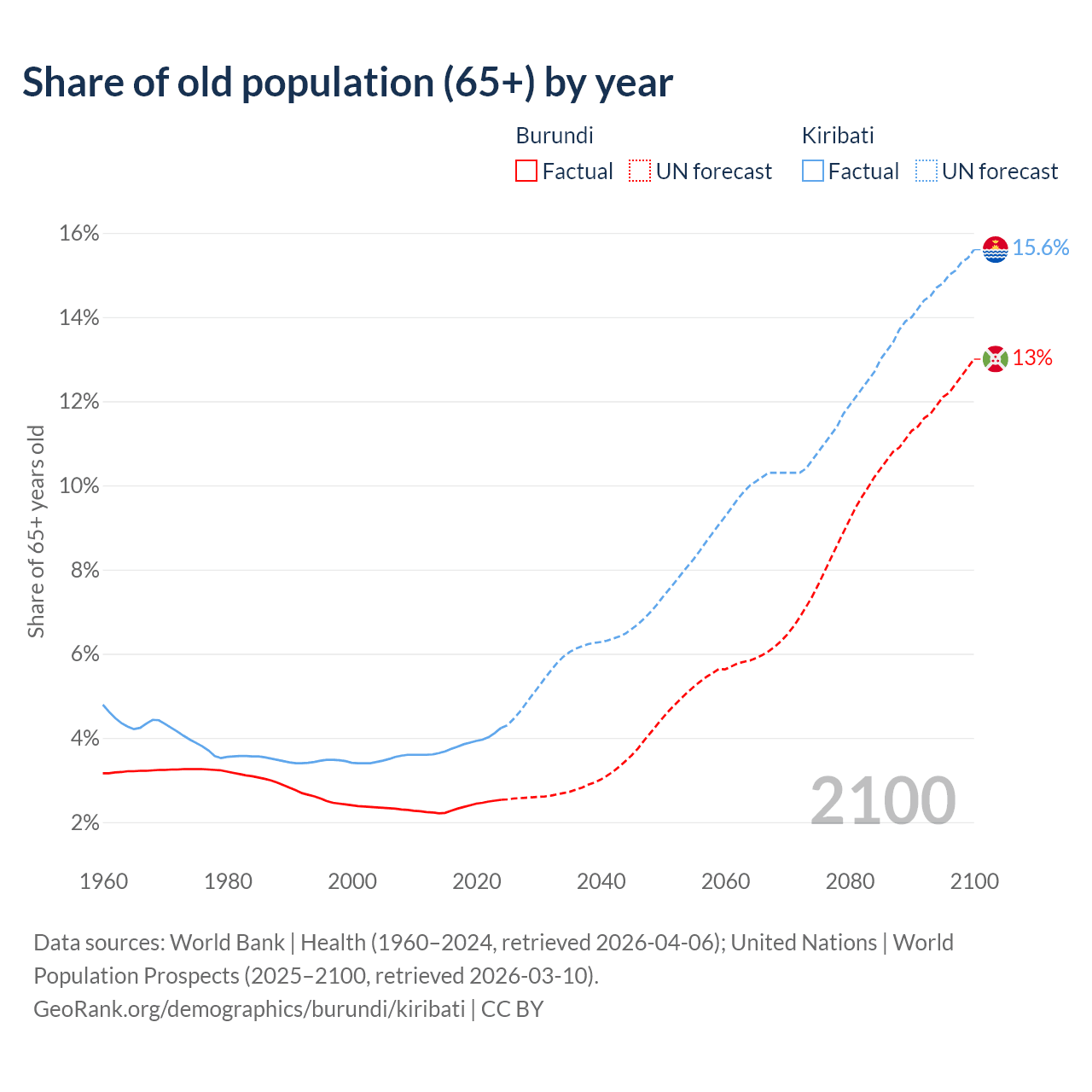 - The share of old-age demographic (65+) in Burundi is 2.53% vs 4.24% in Kiribati.