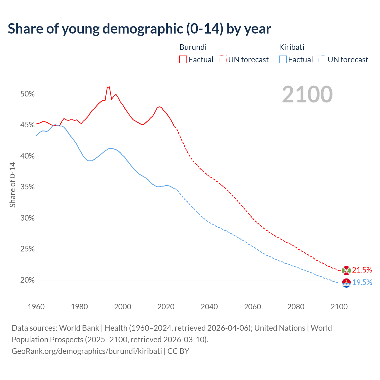 - The share of young demographic (0-15 years old) in Burundi is 44.7% vs 34.7% in Kiribati.