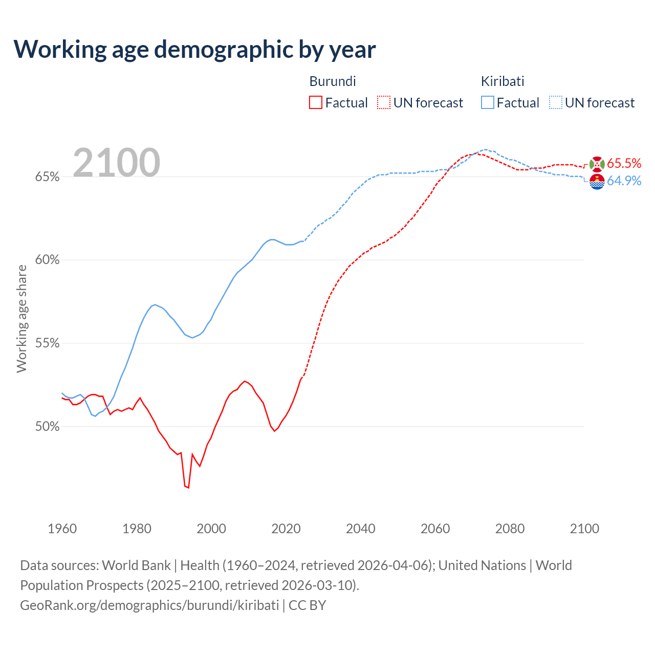 - Burundi has 7.83M working age adults (aged 15-64) vs 84.9K in Kiribati.