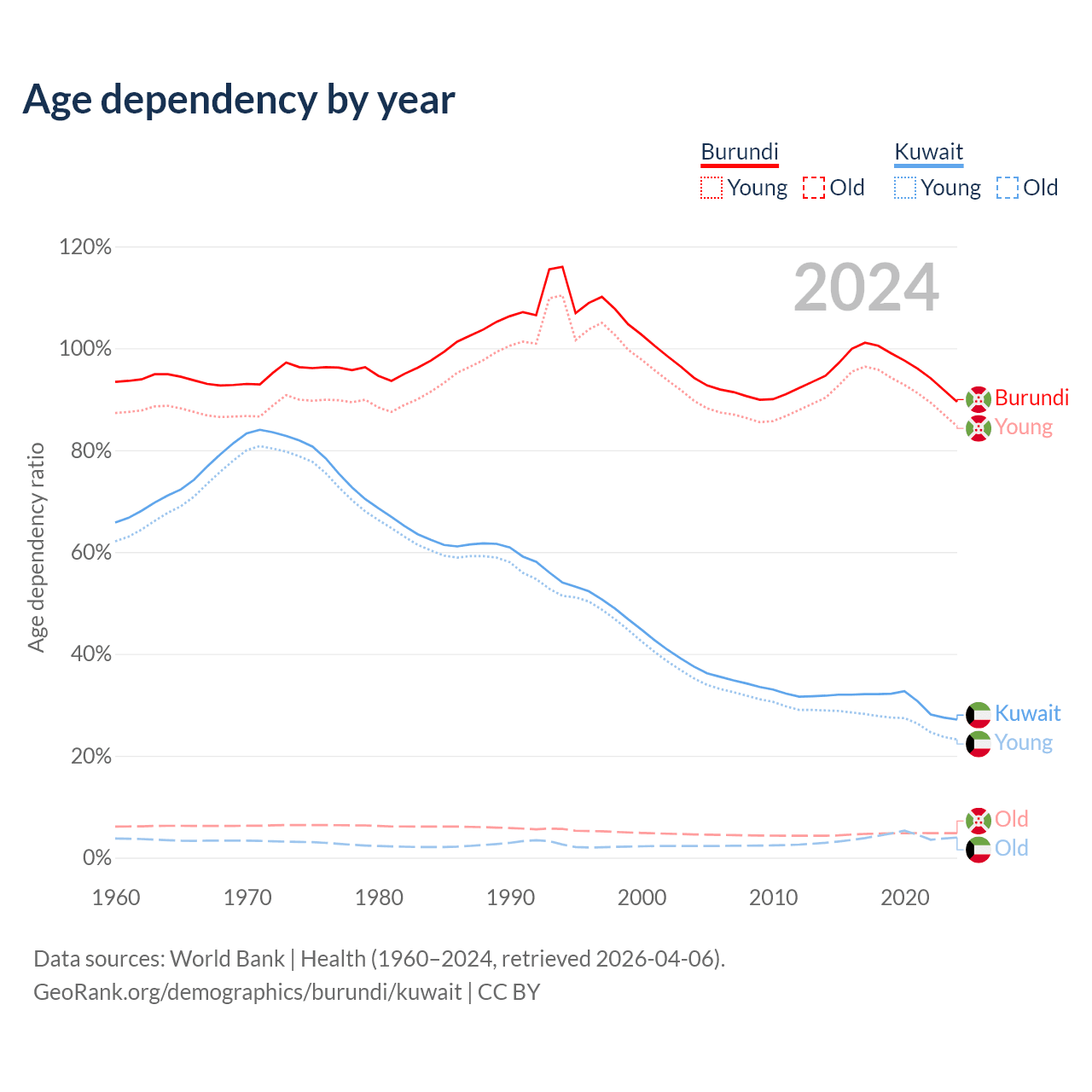 - The share of young demographic (0-15 years old) in Burundi is 44.7% vs 18.2% in Kuwait.
