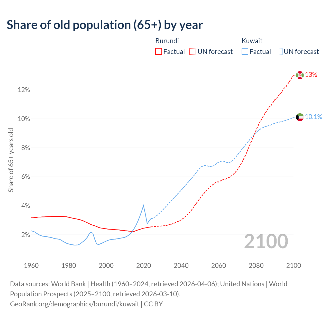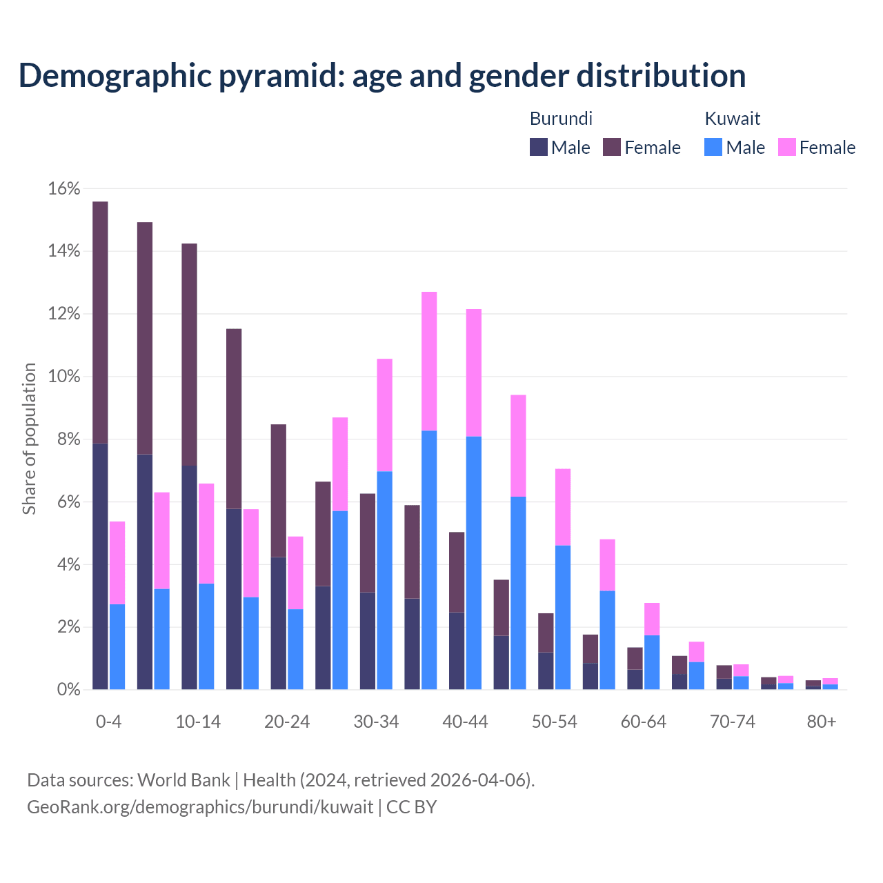 The share of older people aged 65 and over is 2.53% in Burundi and 3.1% in Kuwait. Life expectancy in Burundi compared to Kuwait .