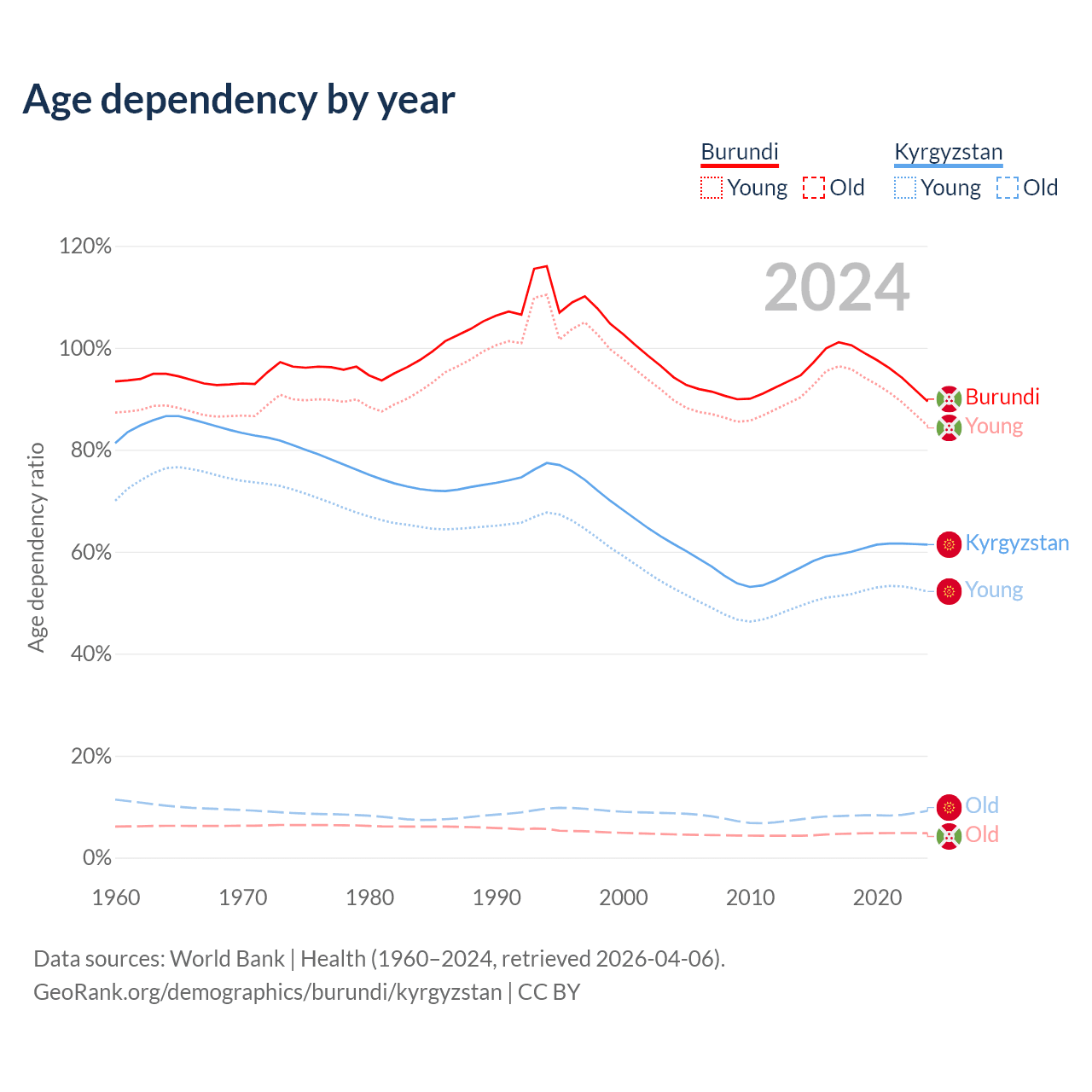 - Burundi is ranked 190/196 by median age (oldest to youngest) vs 126/196 for Kyrgyzstan.