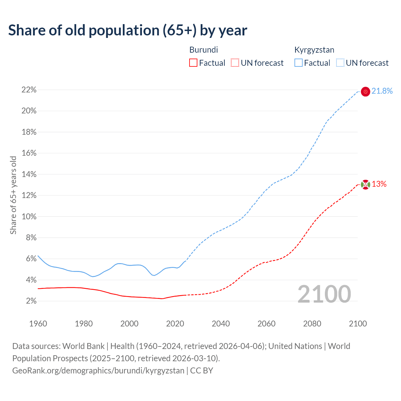 - The share of old-age demographic (65+) in Burundi is 2.53% vs 5.68% in Kyrgyzstan.