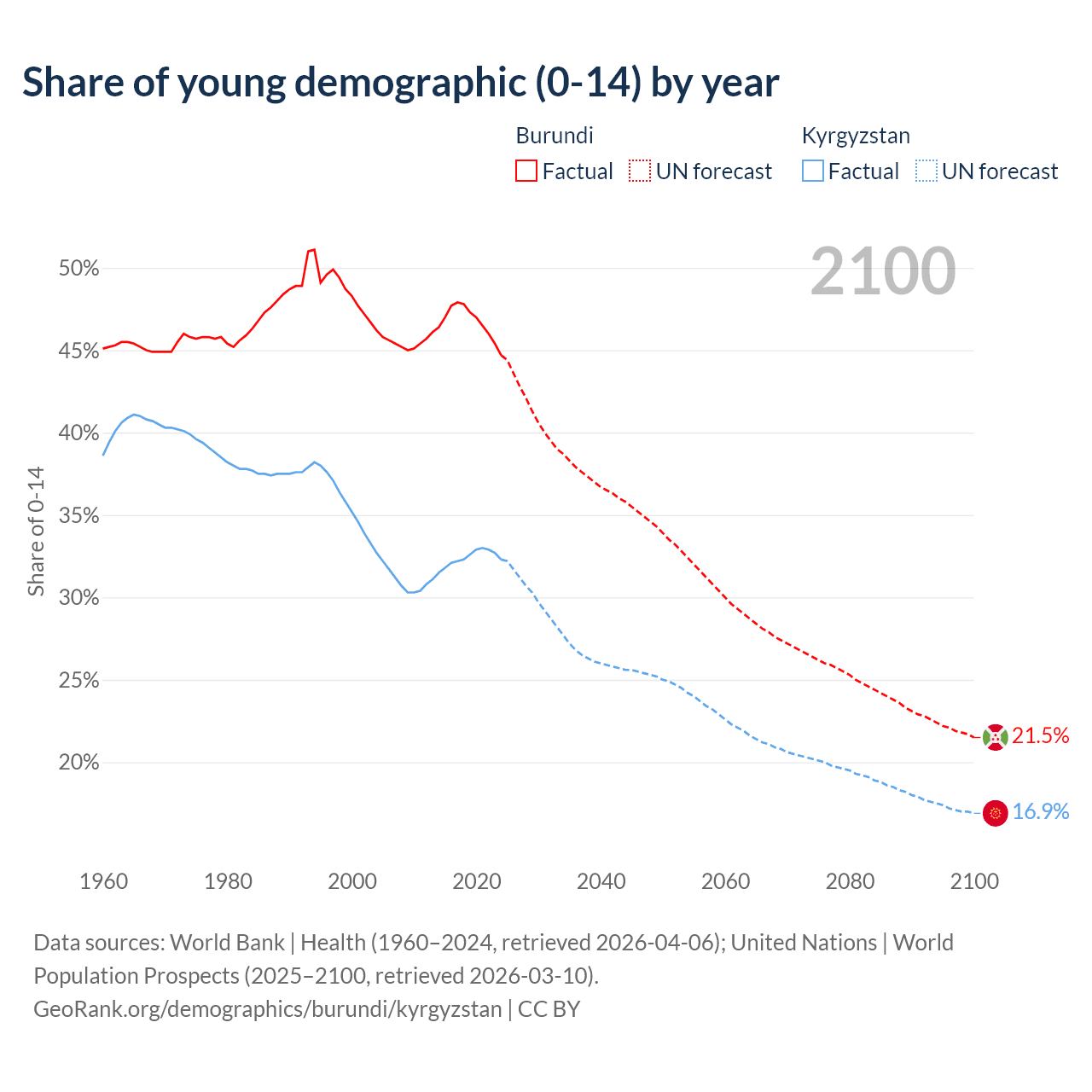 - The share of young demographic (0-15 years old) in Burundi is 44.7% vs 32.3% in Kyrgyzstan.