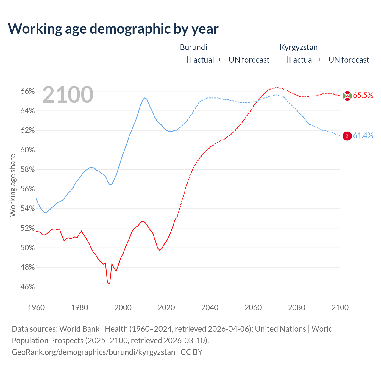 Median age Burundi vs Kyrgyzstan, 1960-2100