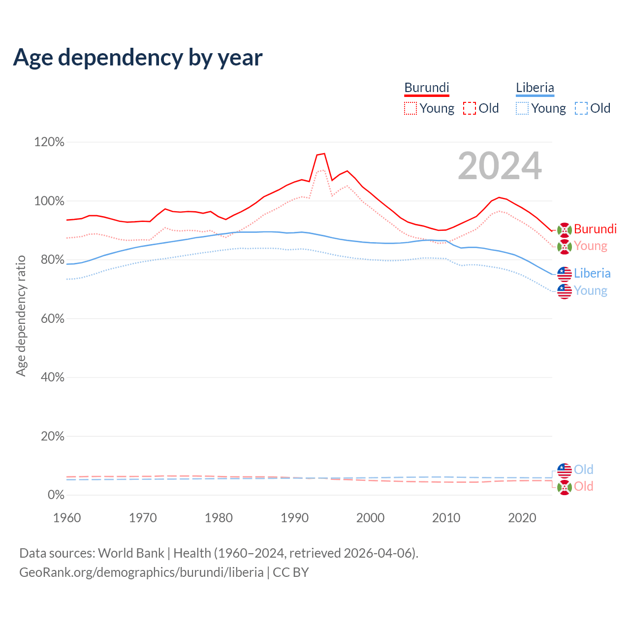 - Burundi is ranked 190/196 by median age (oldest to youngest) vs 169/196 for Liberia.