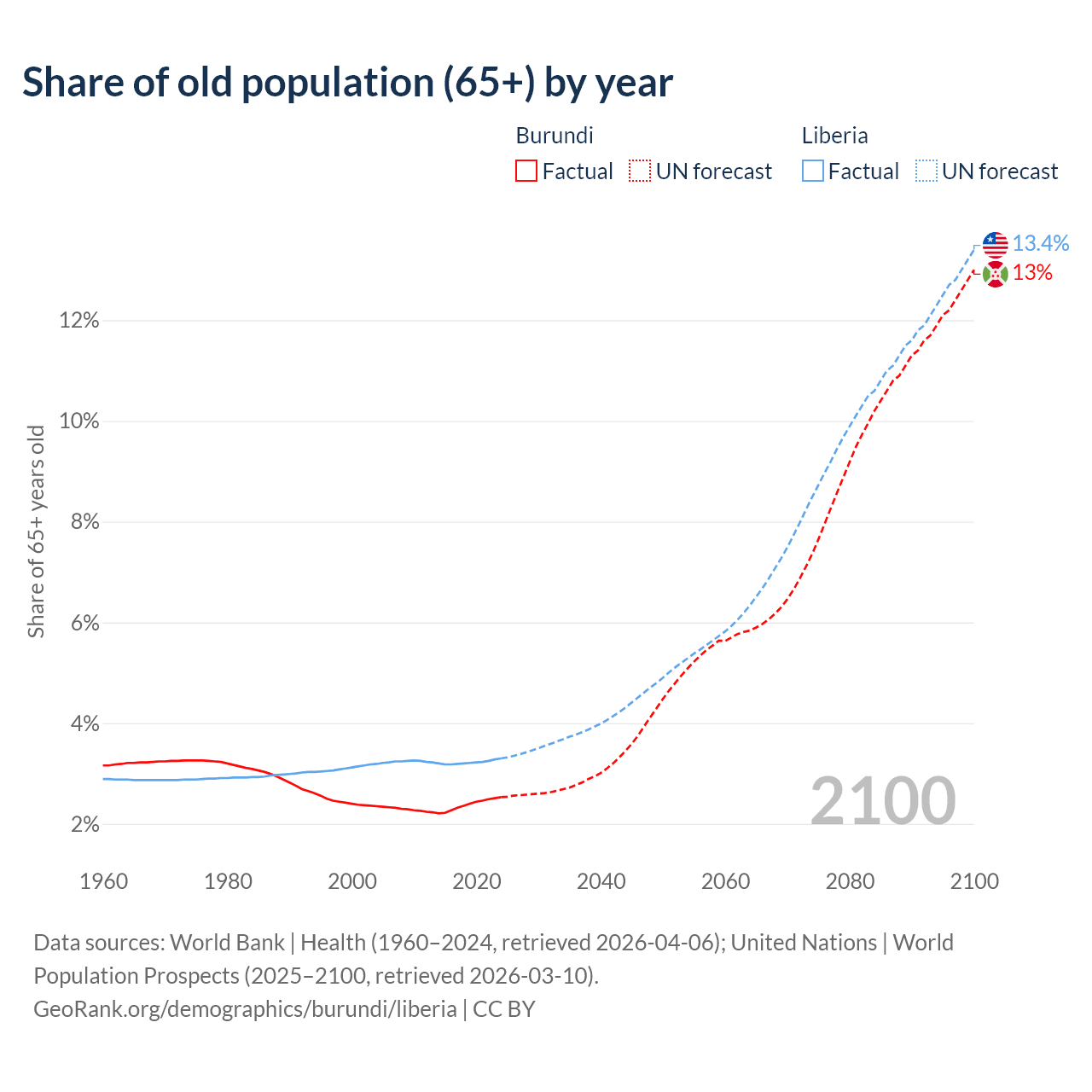 - The share of old-age demographic (65+) in Burundi is 2.53% vs 3.3% in Liberia.