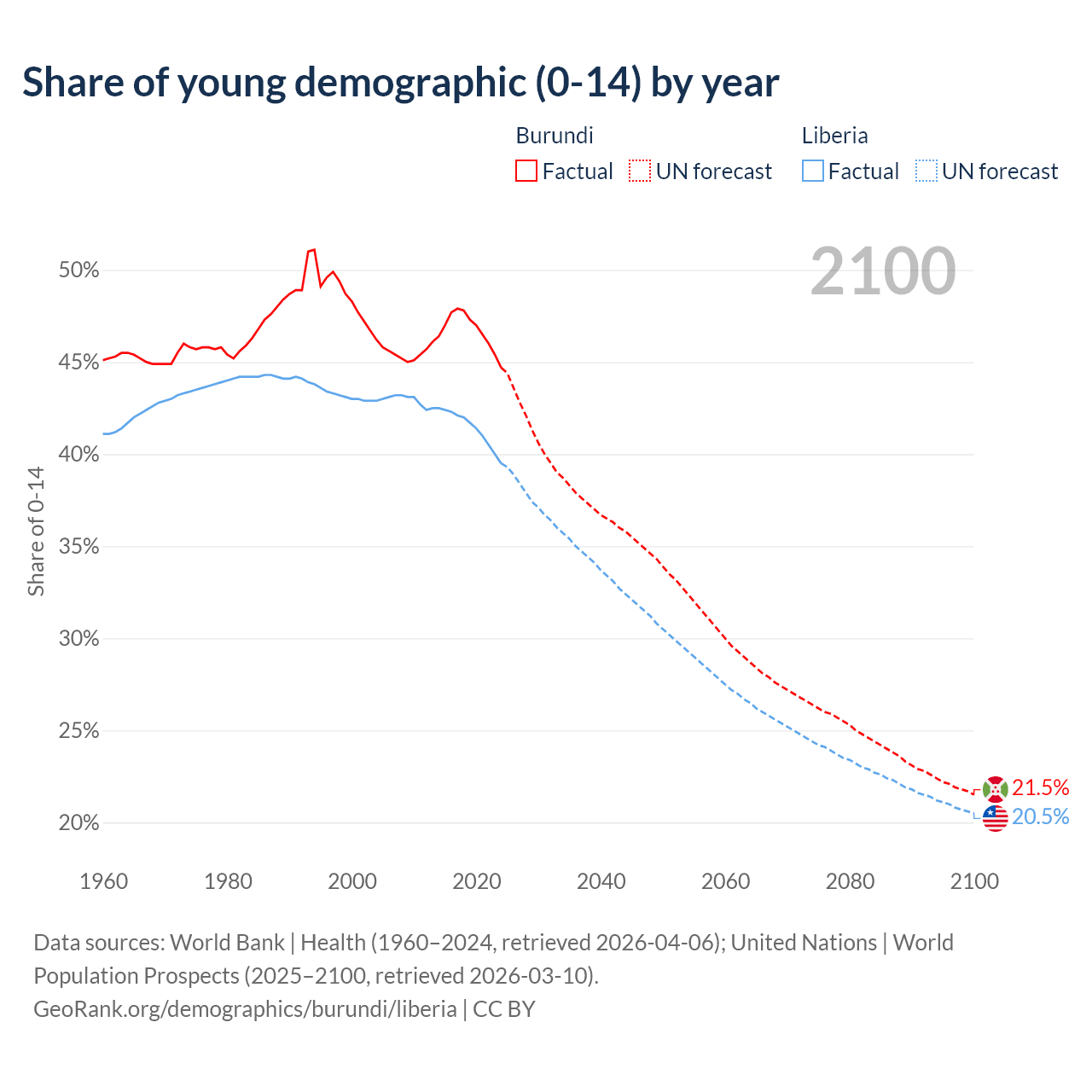 - The share of young demographic (0-15 years old) in Burundi is 44.7% vs 39.5% in Liberia.