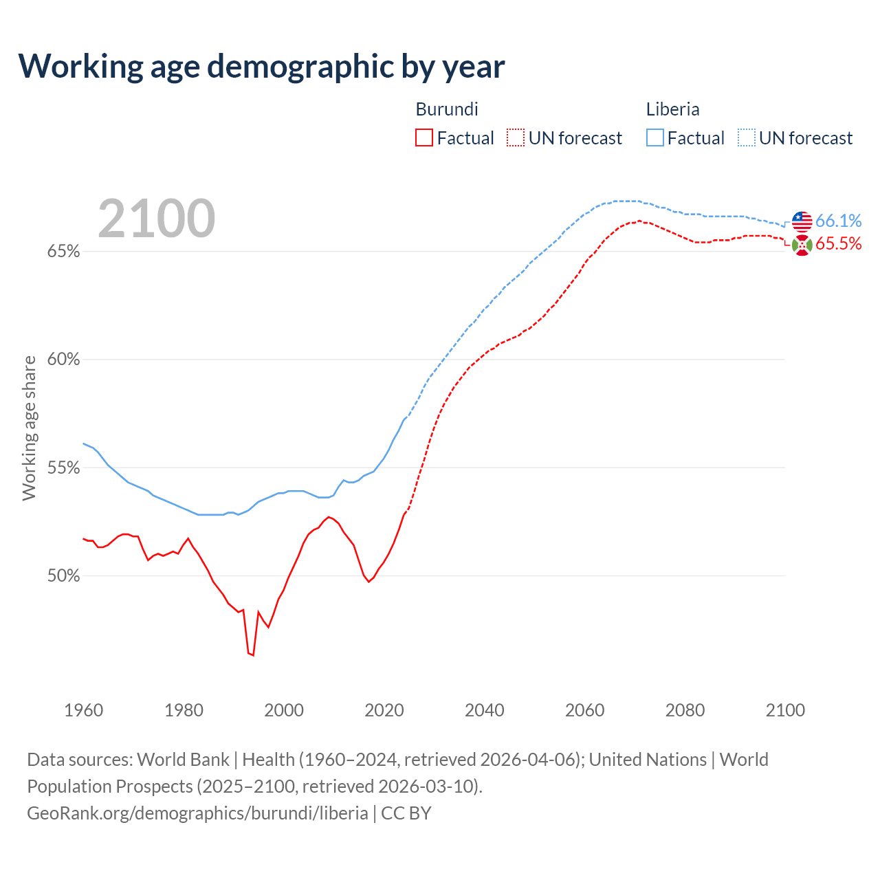 The share of older people aged 65 and over is 2.53% in Burundi and 3.3% in Liberia. Life expectancy in Burundi compared to Liberia .