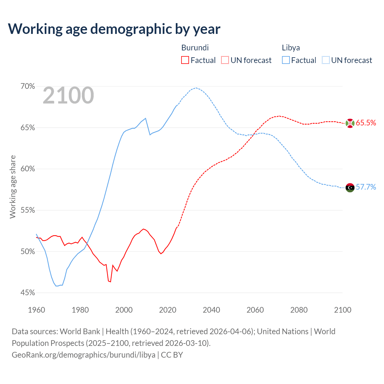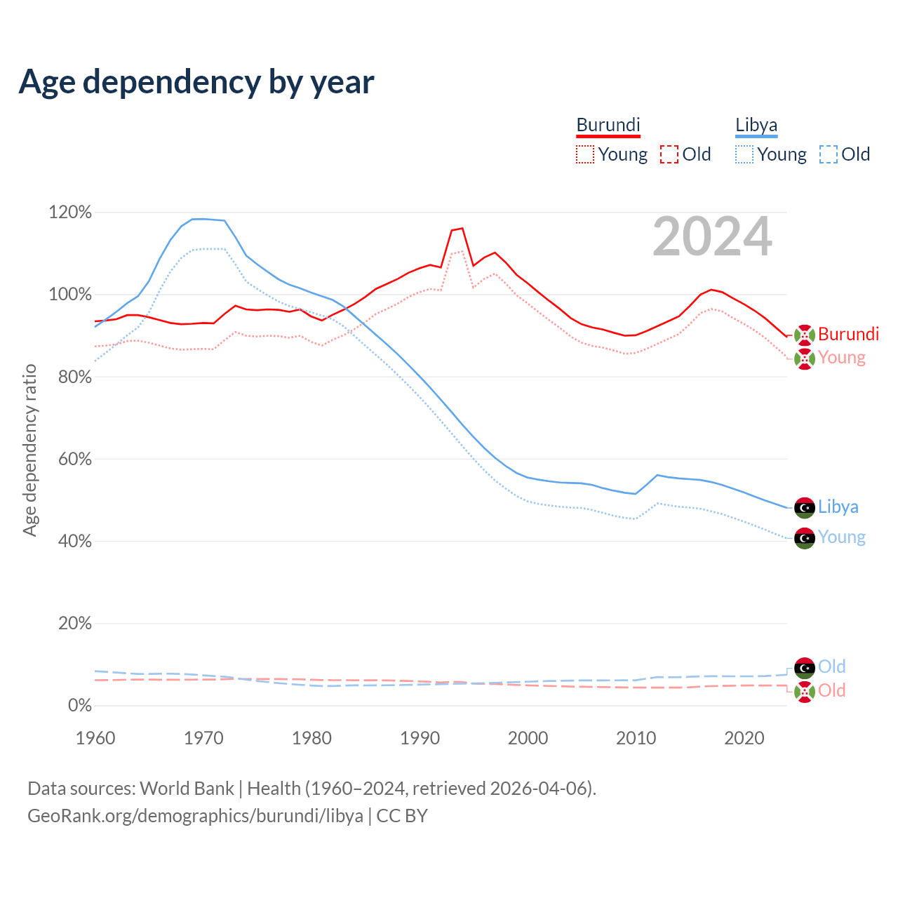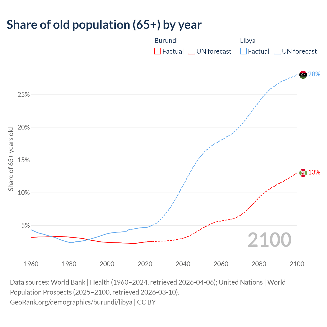 - The share of old-age demographic (65+) in Burundi is 2.53% vs 5.02% in Libya.