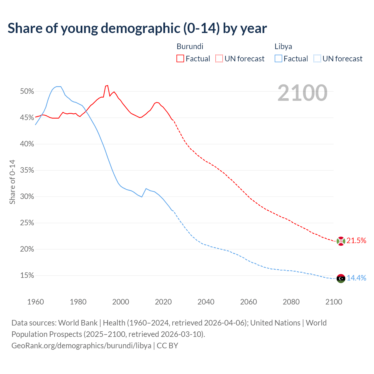 - The share of young demographic (0-15 years old) in Burundi is 44.7% vs 27.4% in Libya.