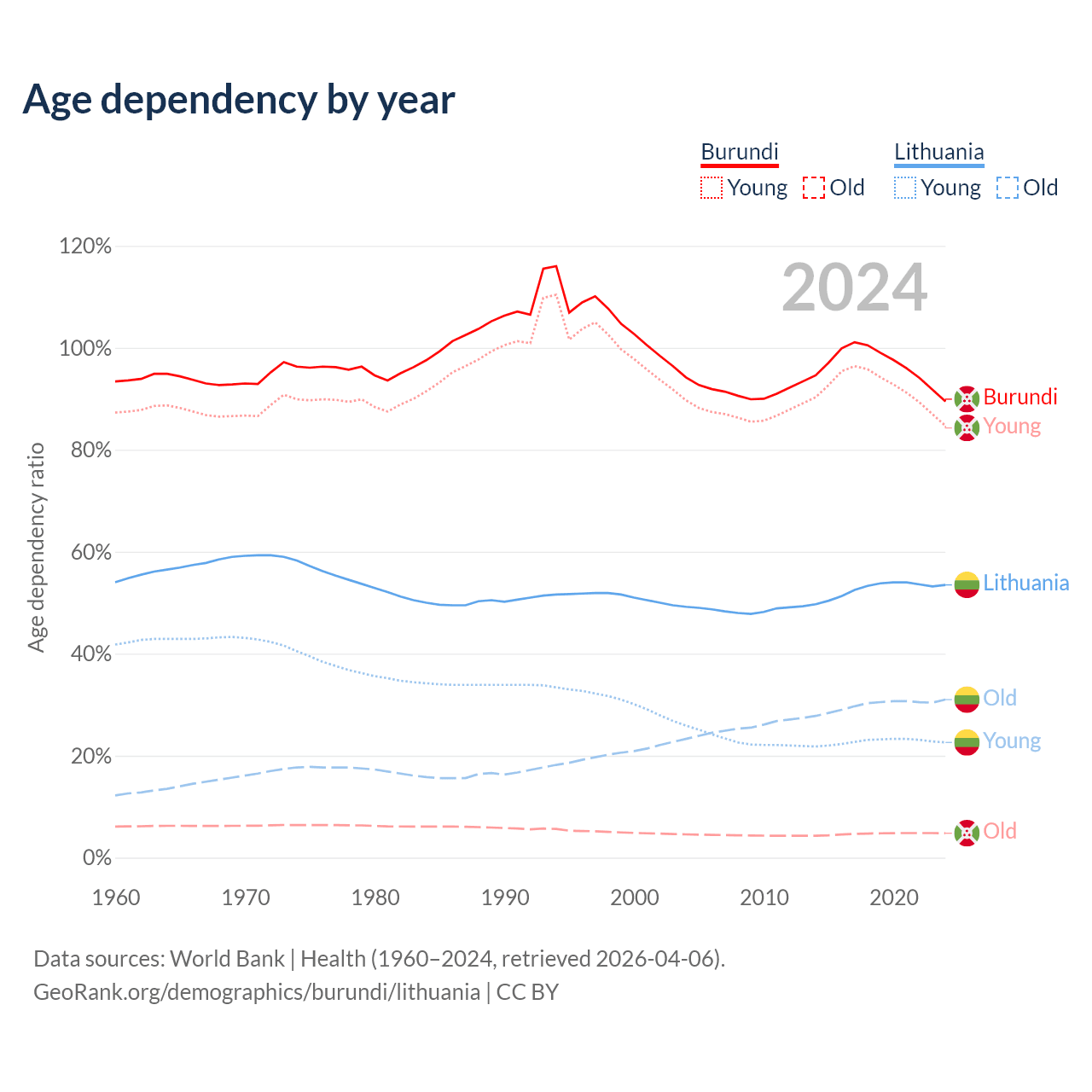 - The share of old-age demographic (65+) in Burundi is 2.53% vs 20.2% in Lithuania.