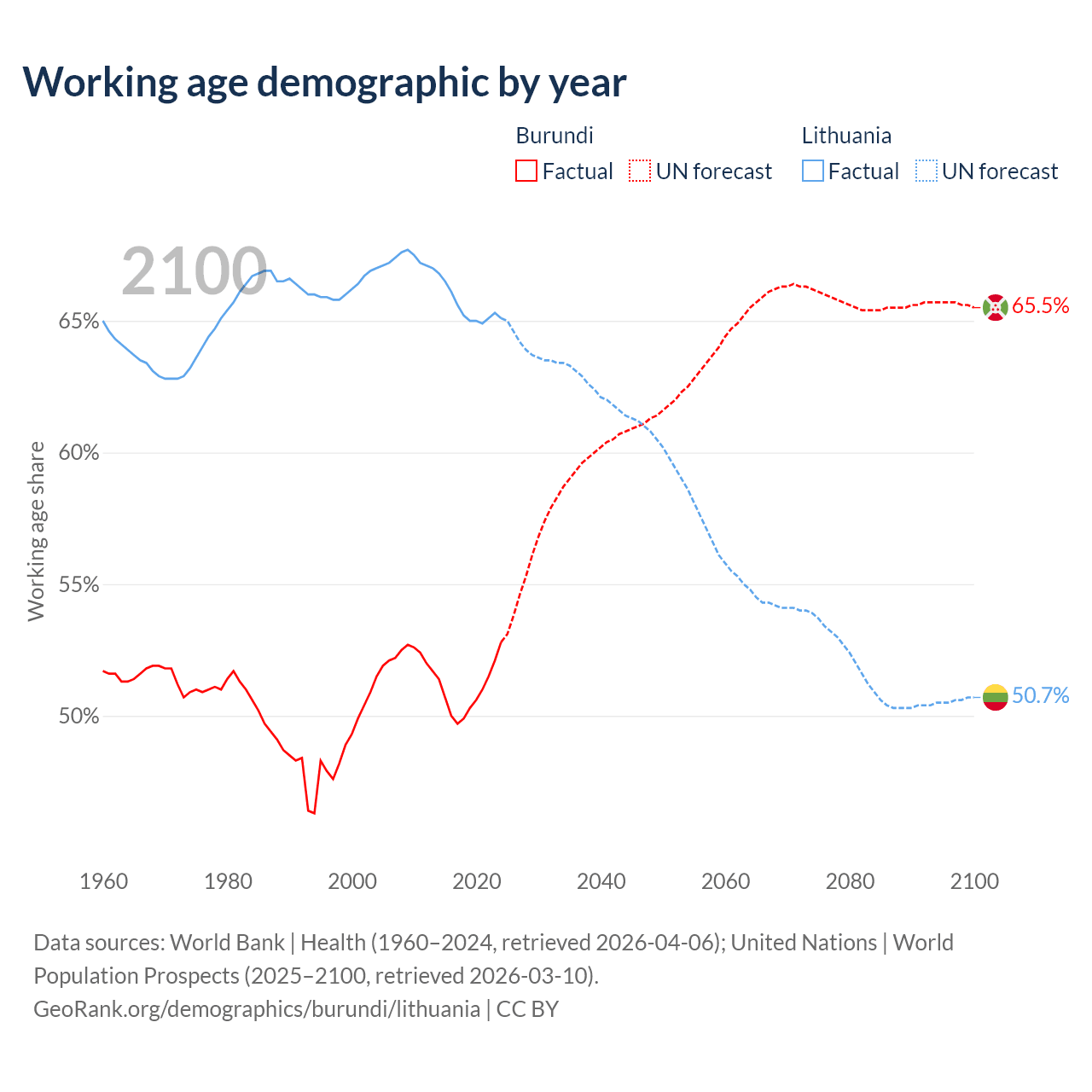 Median age Burundi vs Lithuania, 1960-2100