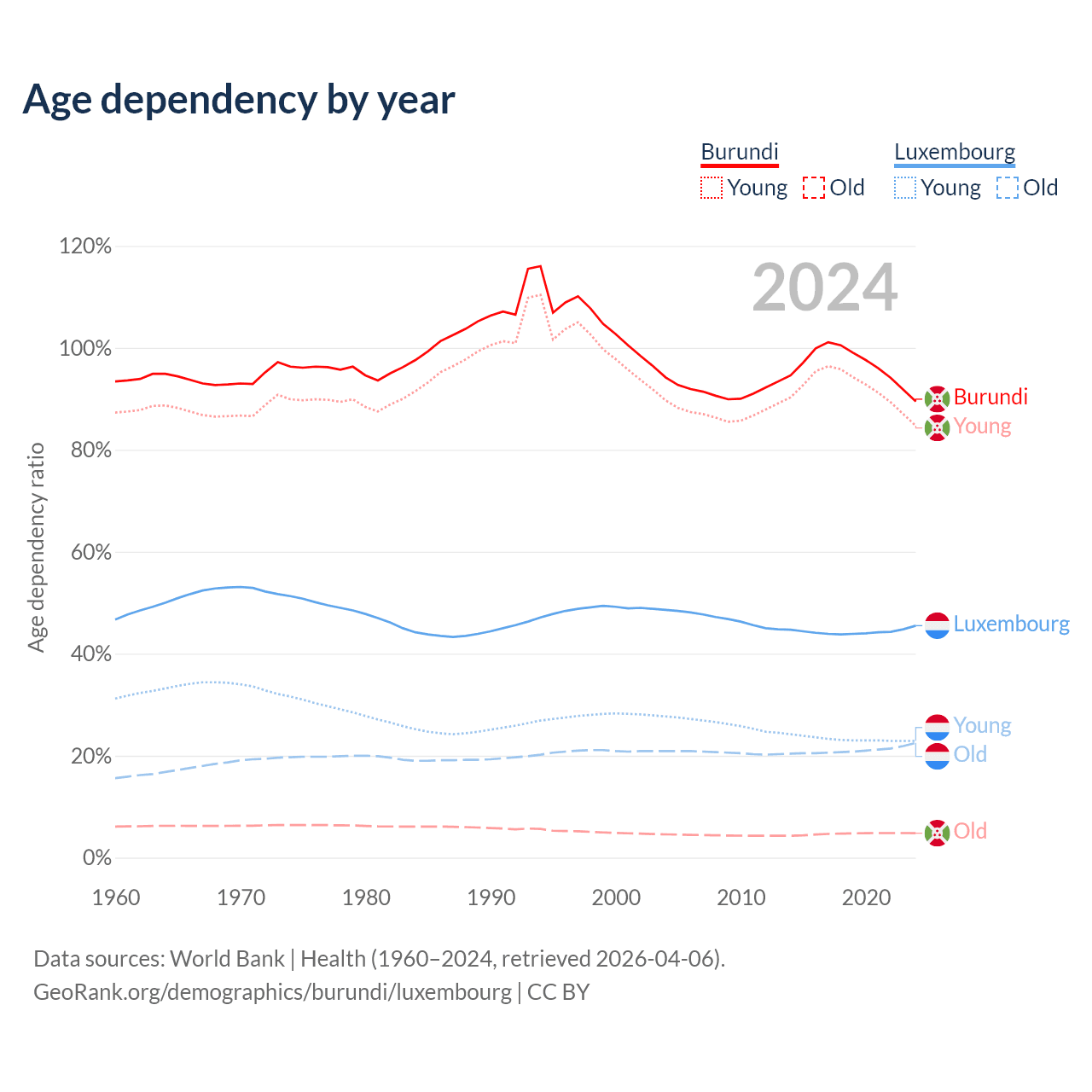 - The share of old-age demographic (65+) in Burundi is 2.53% vs 15.5% in Luxembourg.