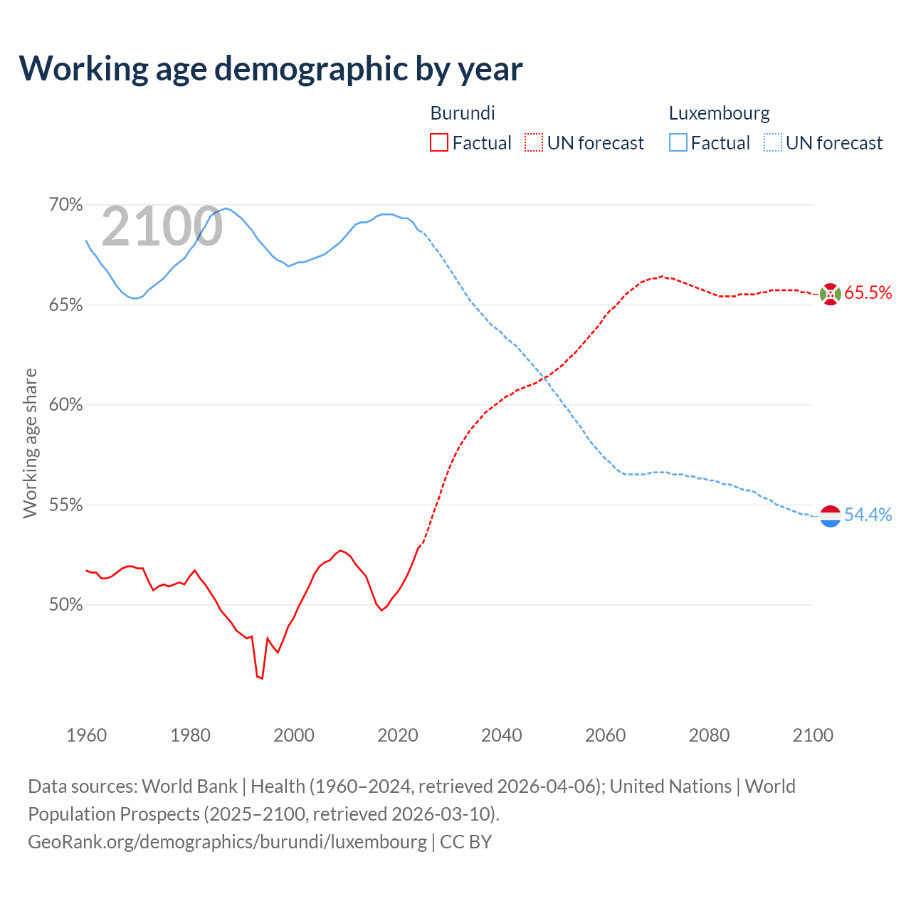 Median age Burundi vs Luxembourg, 1960-2100