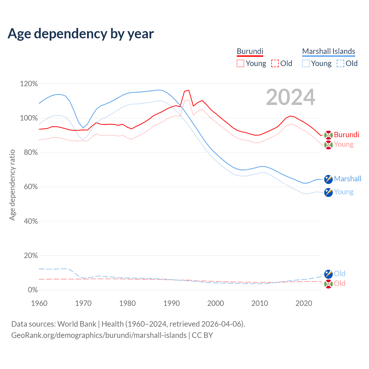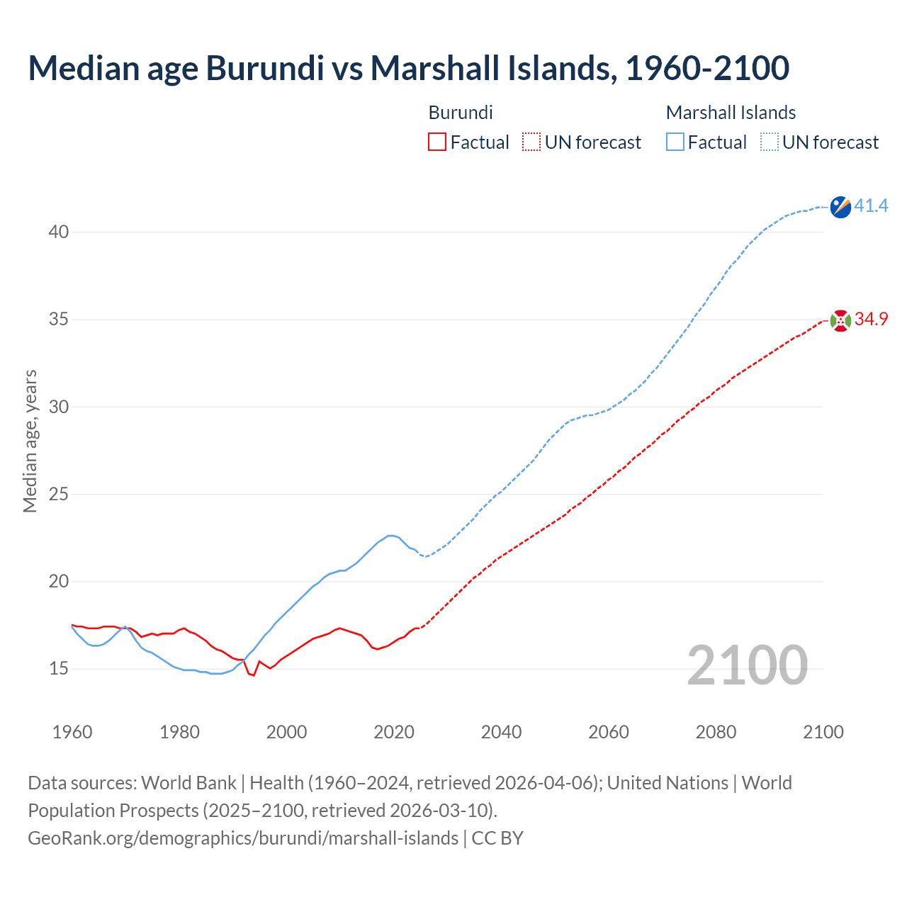- Burundi is ranked 190/196 by median age (oldest to youngest) vs 150/196 for the Marshall Islands.