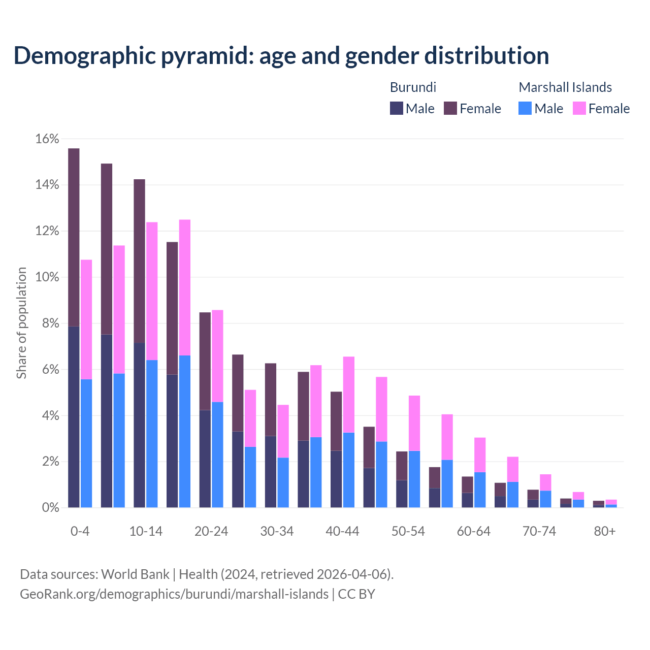 - As of 2026, the population of Burundi is 14.8M vs 35.1K in the Marshall Islands - 423 times difference.