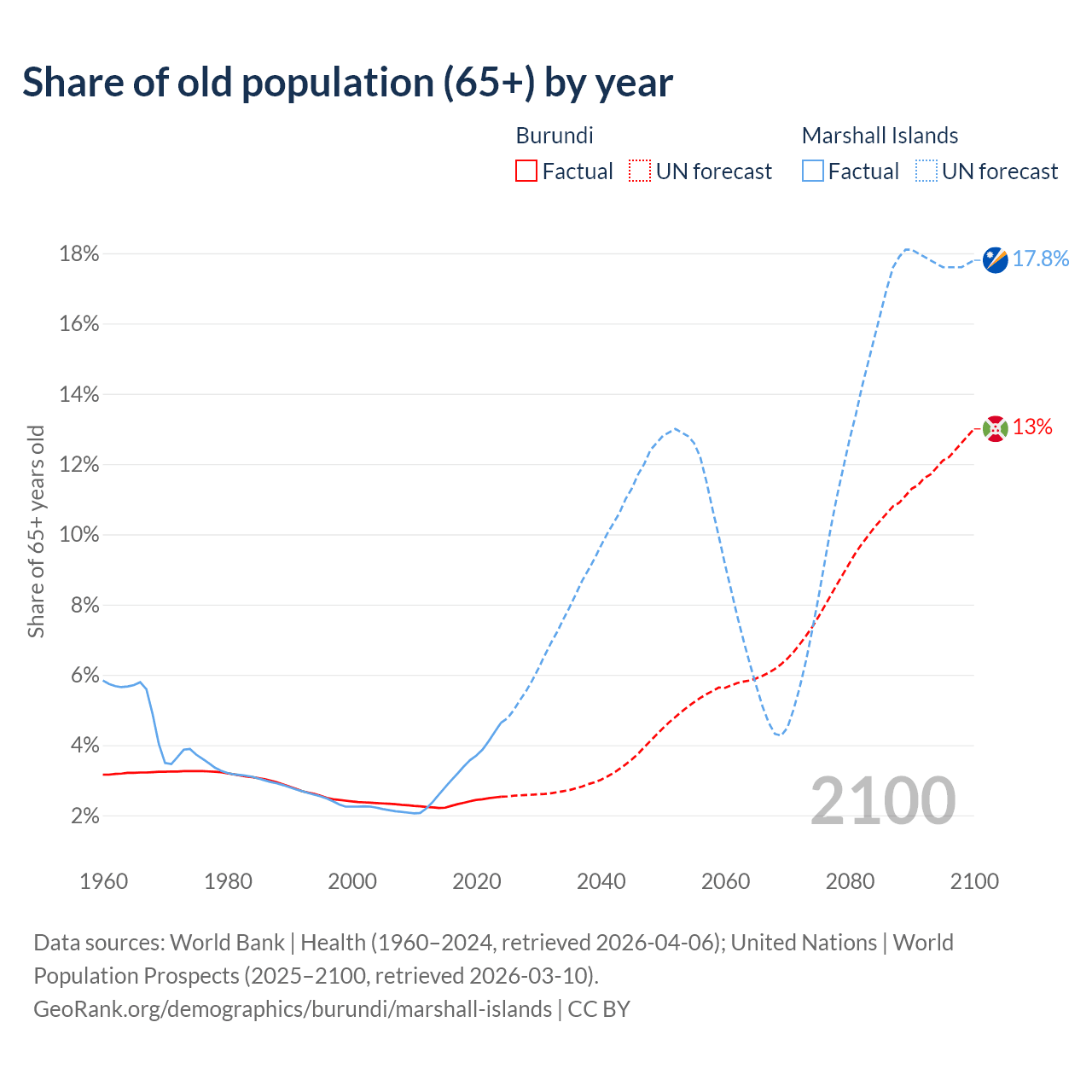 - The share of old-age demographic (65+) in Burundi is 2.53% vs 4.64% in the Marshall Islands.