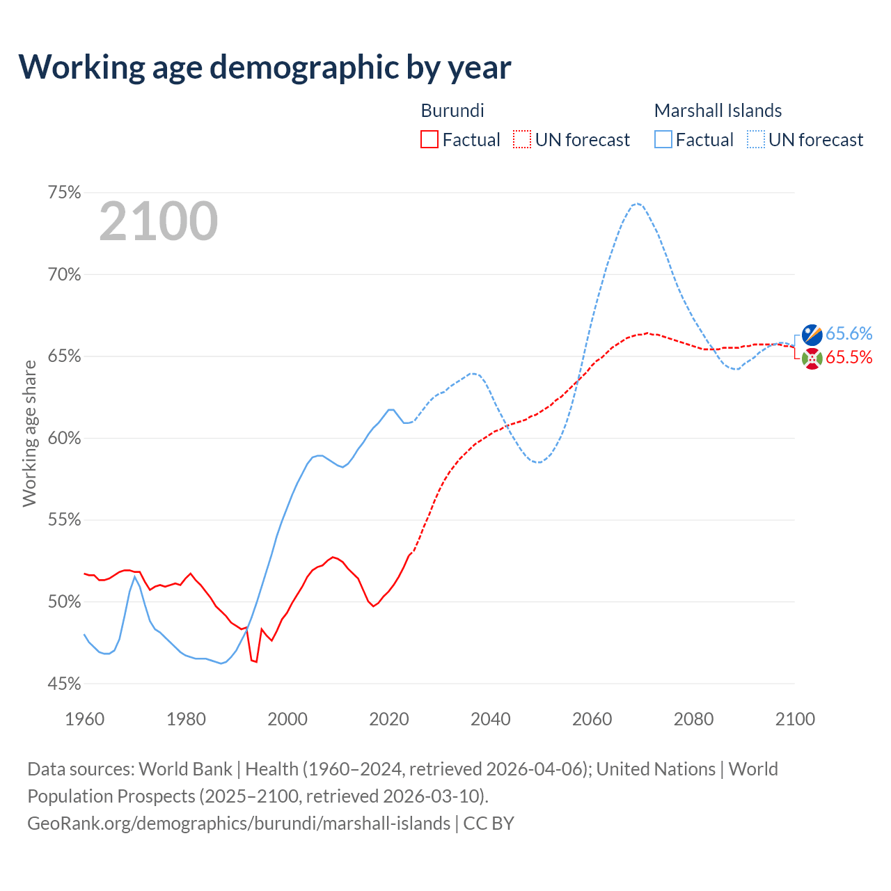 - Burundi has 7.83M working age adults (aged 15-64) vs 21.3K in the Marshall Islands.
