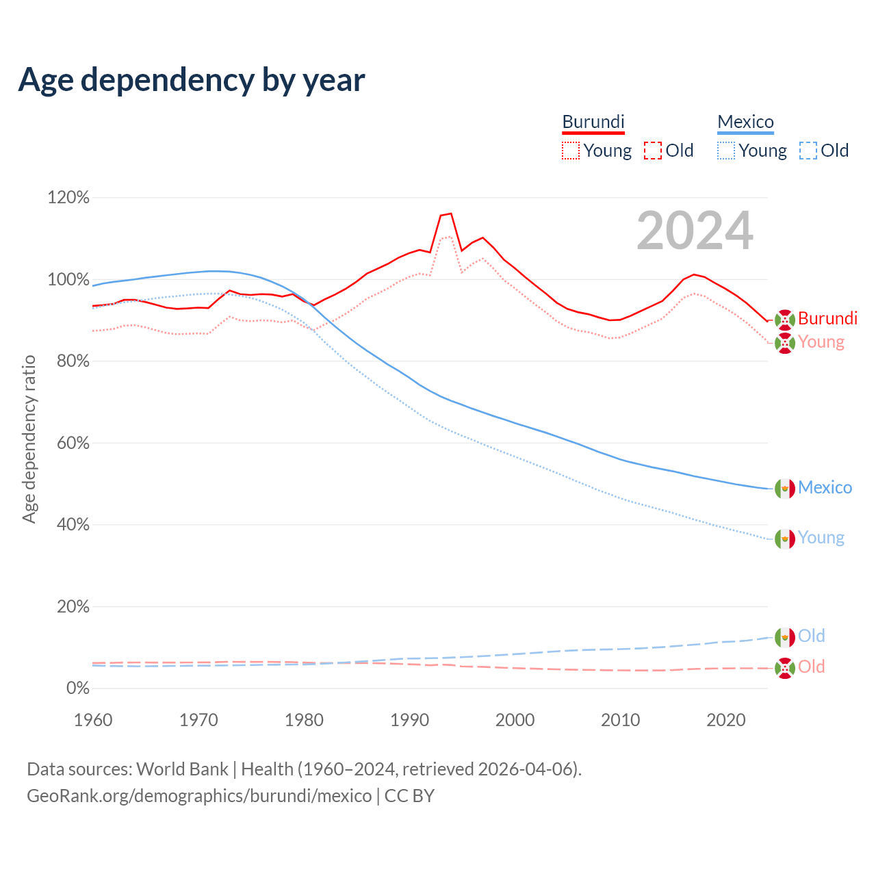 - Burundi is ranked 190/196 by median age (oldest to youngest) vs 102/196 for Mexico.