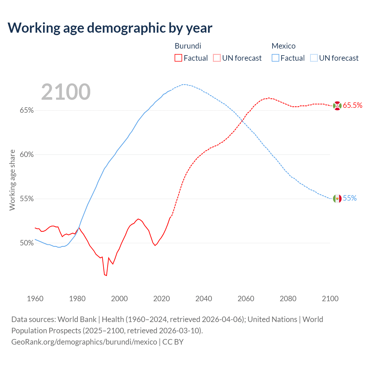- Burundi has 7.83M working age adults (aged 15-64) vs 89.6M in Mexico.