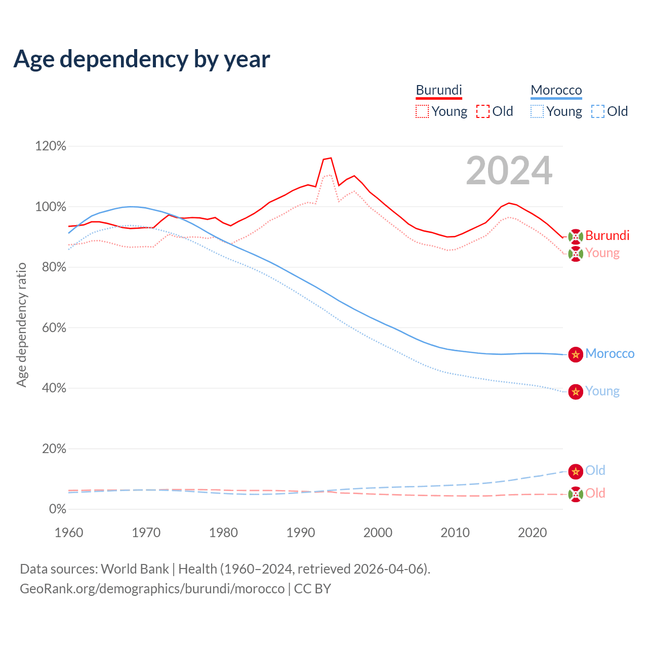 - Burundi is ranked 190/196 by median age (oldest to youngest) vs 100/196 for Morocco.