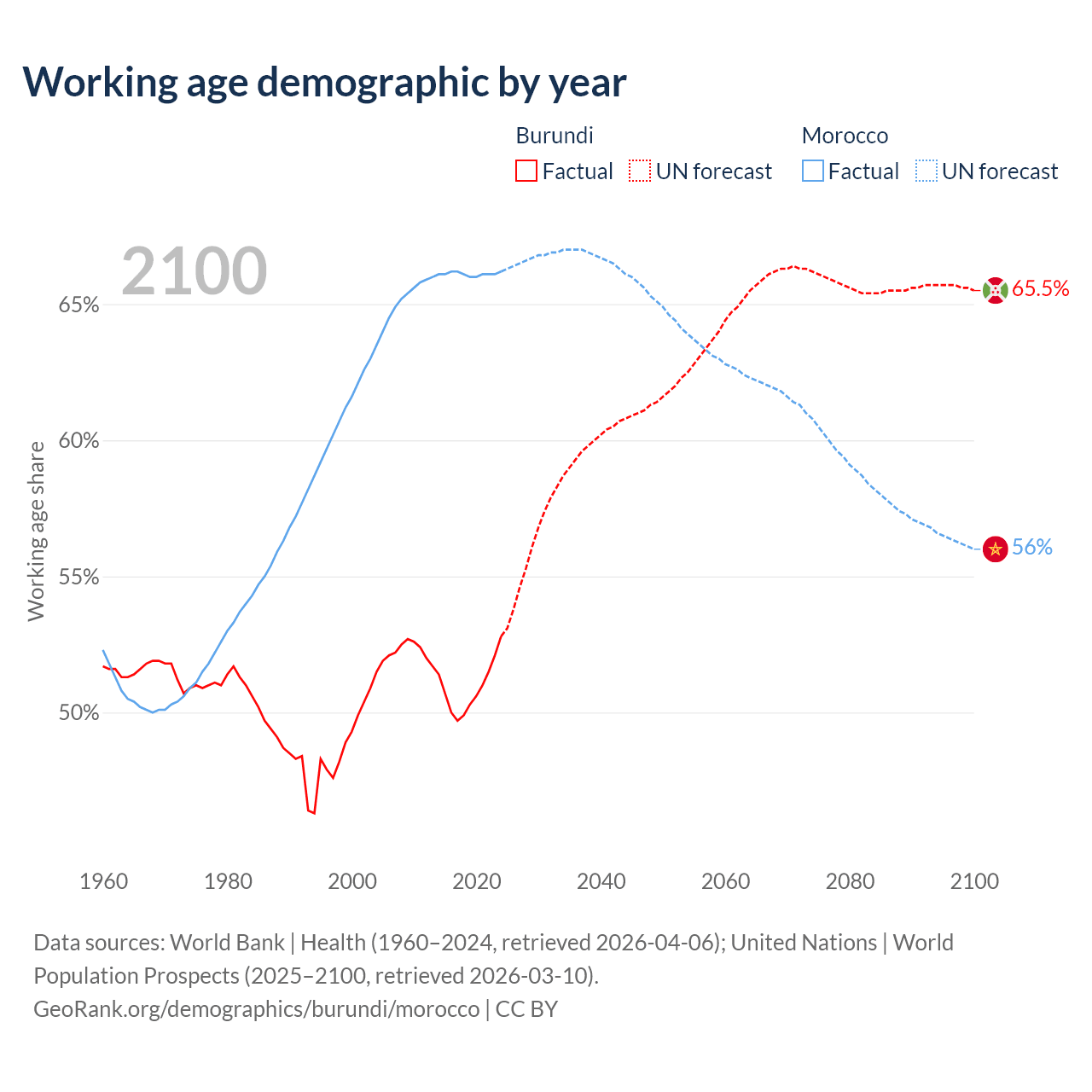 Median age Burundi vs Morocco, 1960-2100