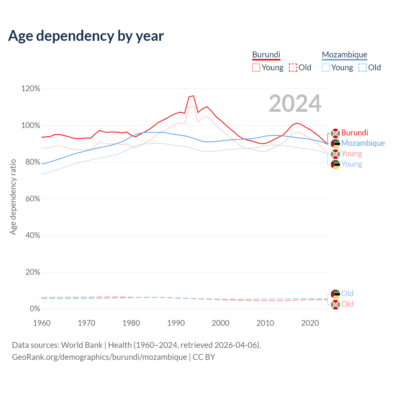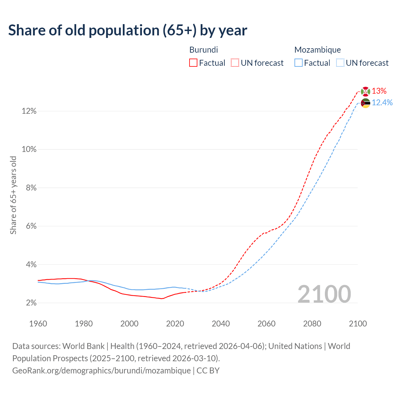 - The share of old-age demographic (65+) in Burundi is 2.53% vs 2.75% in Mozambique.