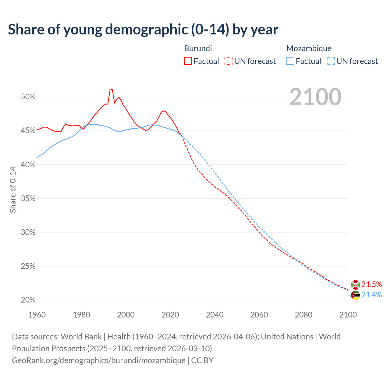 - The share of young demographic (0-15 years old) in Burundi is 44.7% vs 44.5% in Mozambique.