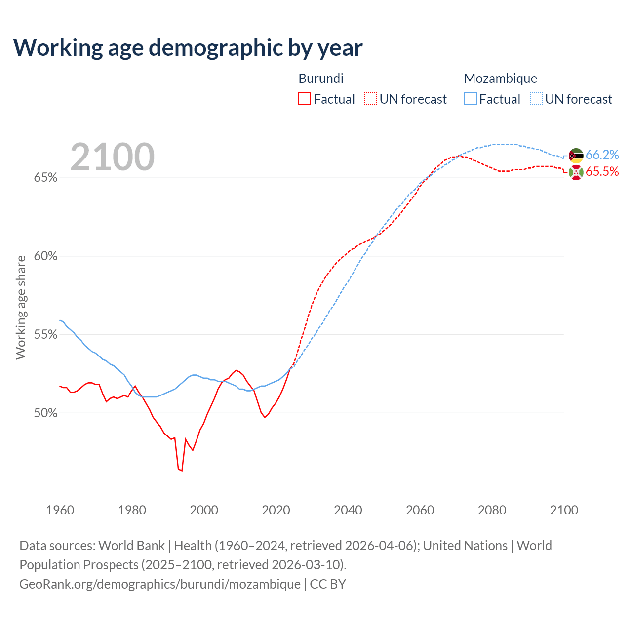 The share of older people aged 65 and over is 2.53% in Burundi and 2.75% in Mozambique. Life expectancy in Burundi compared to Mozambique .