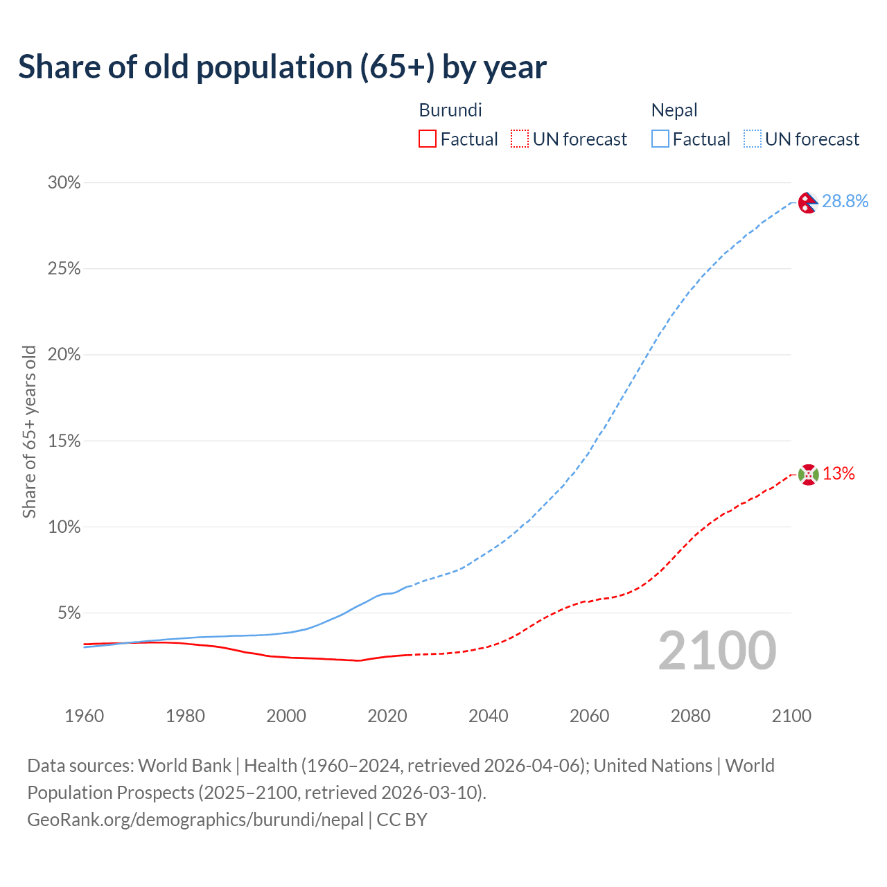 - The share of old-age demographic (65+) in Burundi is 2.53% vs 6.5% in Nepal.