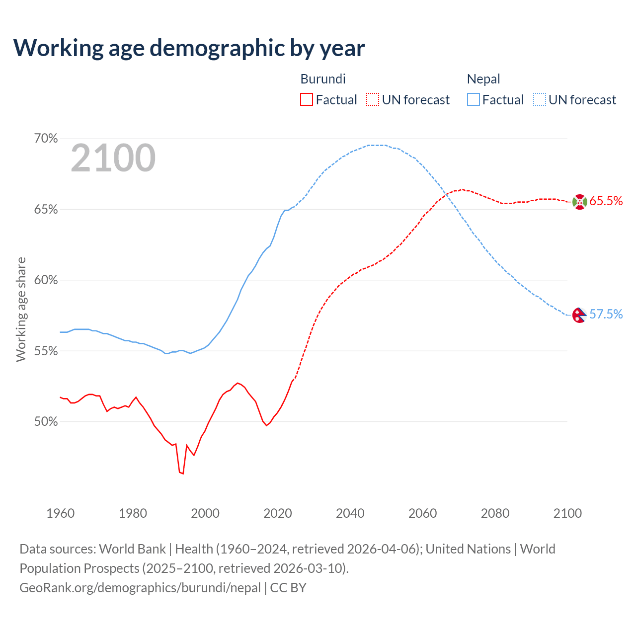 - As of 2026, the population of Burundi is 14.8M vs 29.6M in Nepal - 2 times difference.