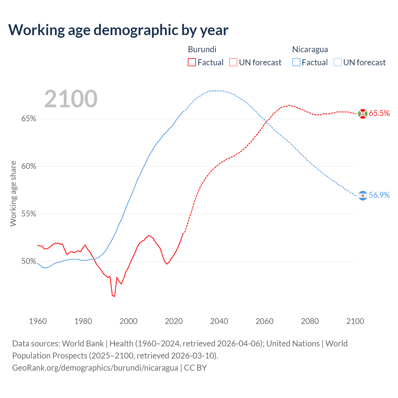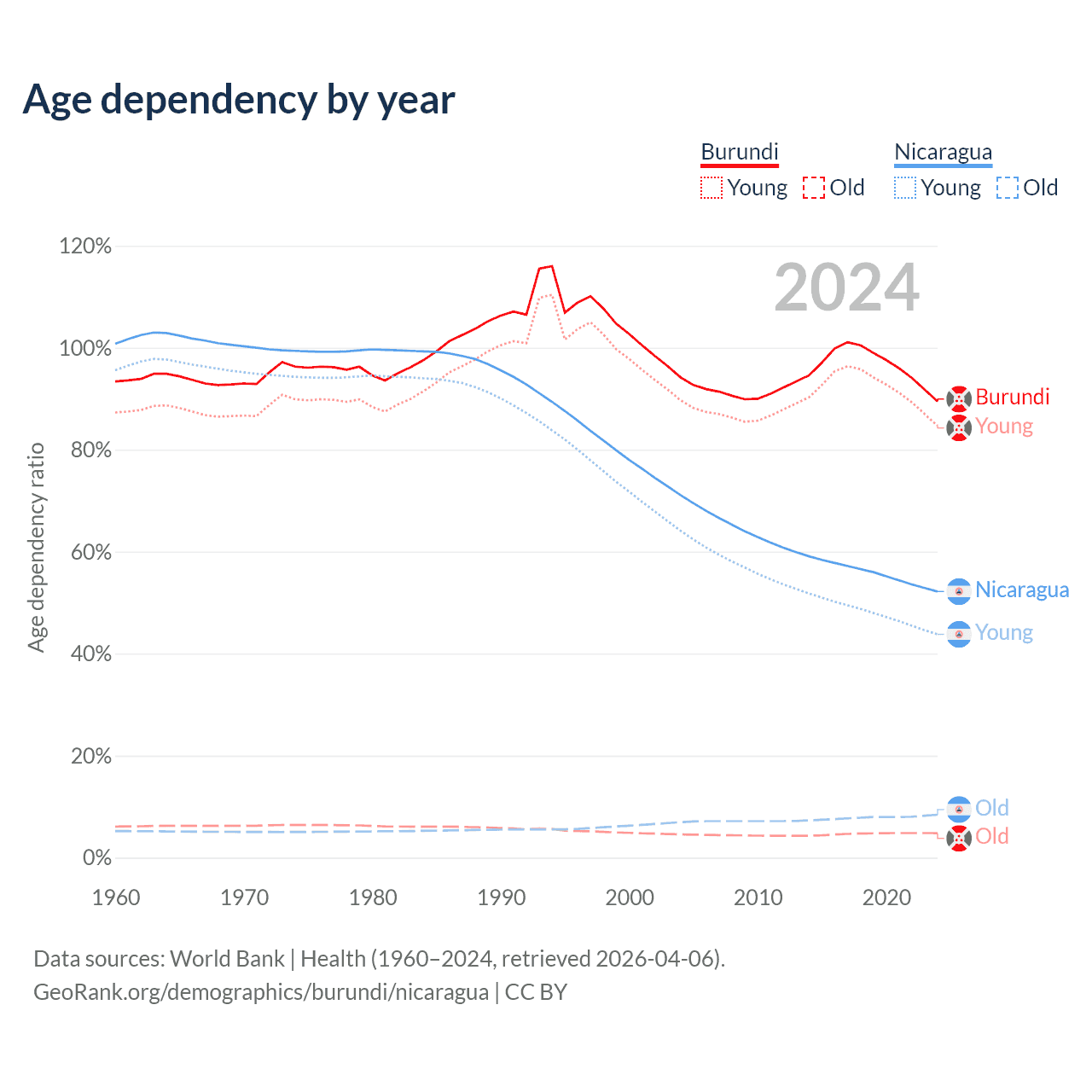 - The share of old-age demographic (65+) in Burundi is 2.53% vs 5.53% in Nicaragua.