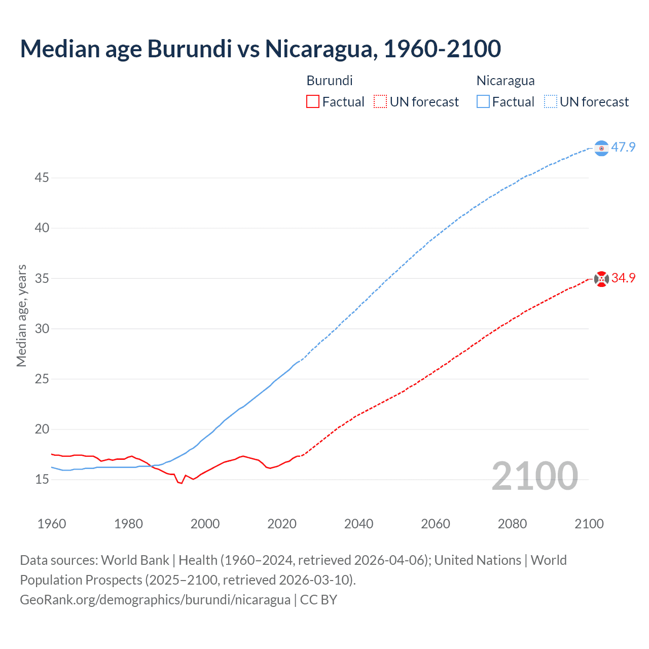 Median age Burundi vs Nicaragua, 1960-2100