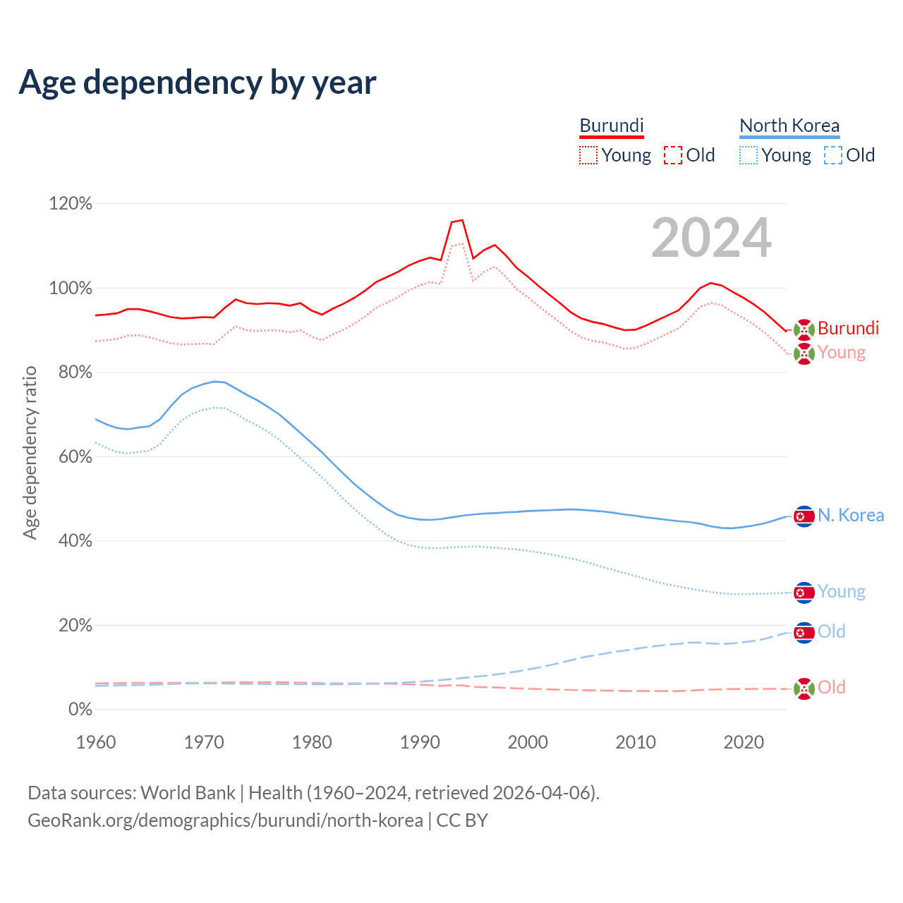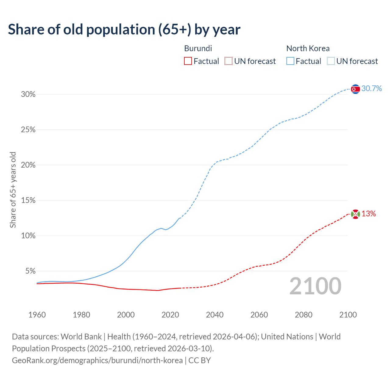 - The share of old-age demographic (65+) in Burundi is 2.53% vs 12.4% in North Korea.