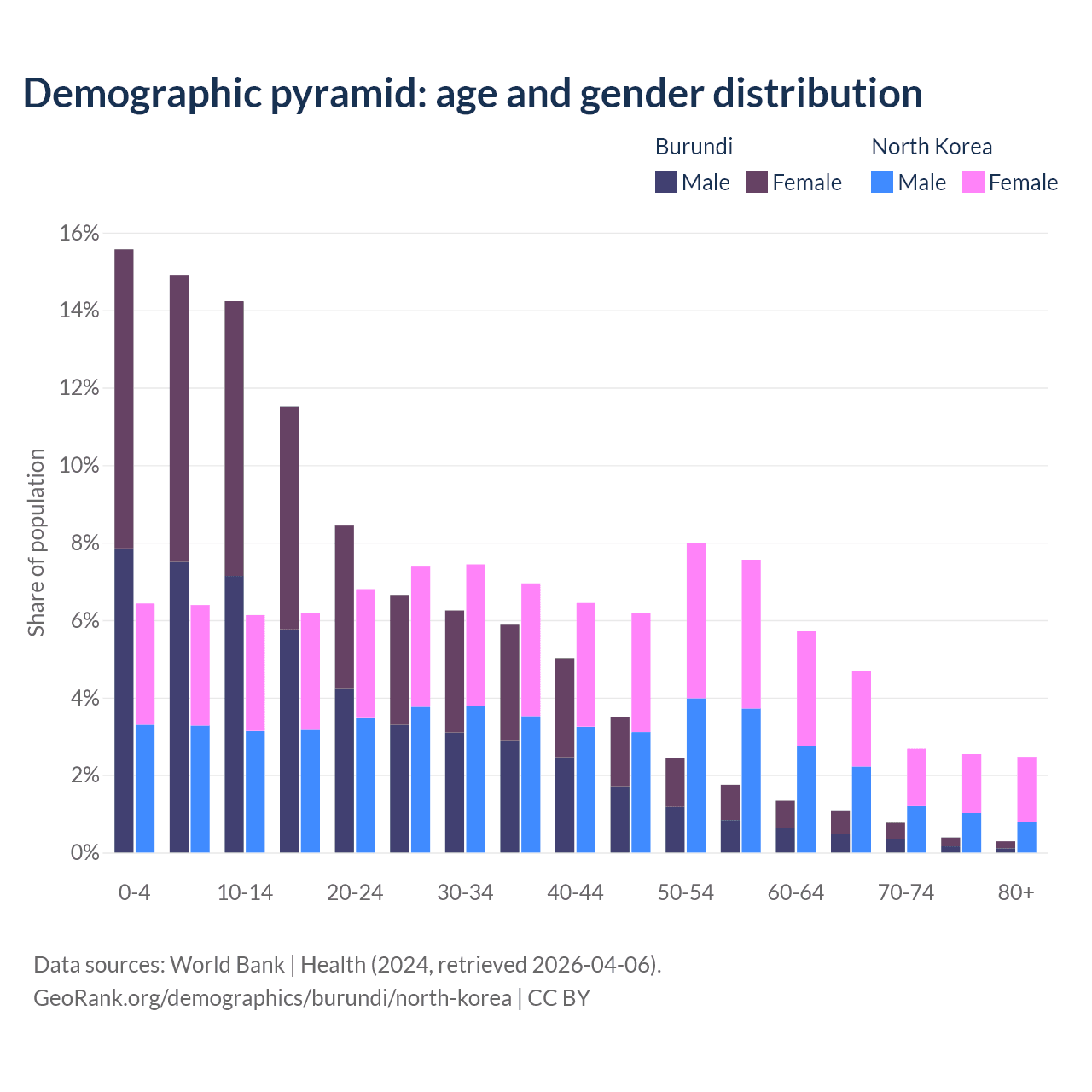 The share of older people aged 65 and over is 2.53% in Burundi and 12.4% in North Korea. Life expectancy in Burundi compared to North Korea .